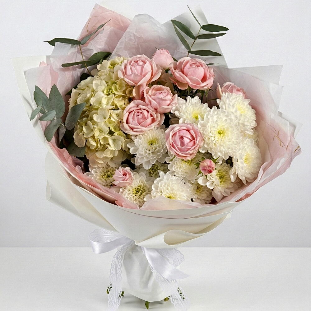 2 white hydrangeas, 7 white chrysanthemums, and 3 pink peony roses arranged in a premium design for a sophisticated look.