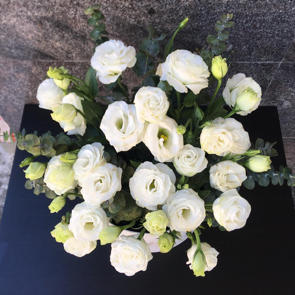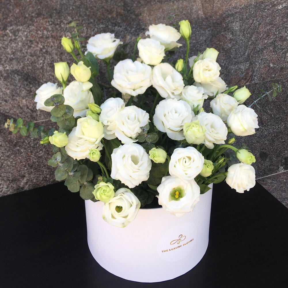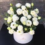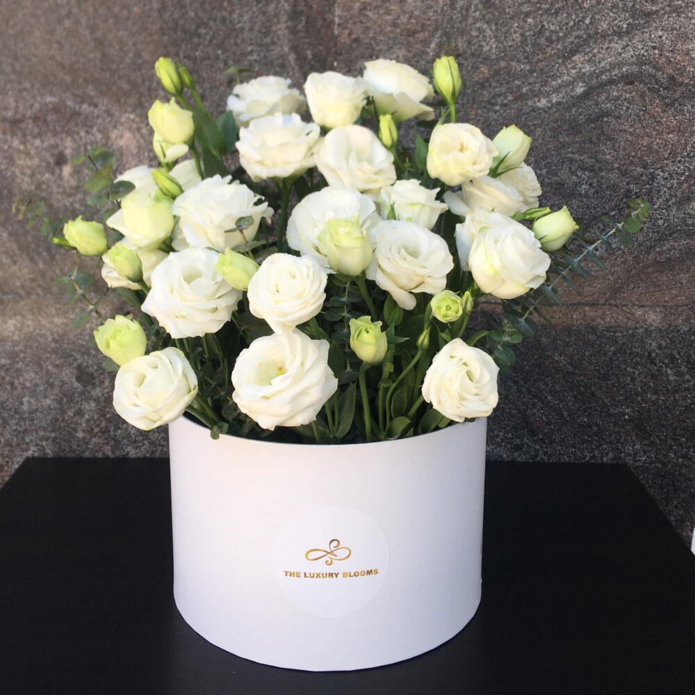 Eustoma white - 15 pcs eucalyptus leaves - 11 pcs white medium hatbox - 1 pcs