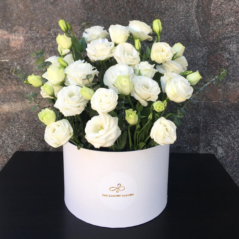 White Eustoma in Medium Hatbox