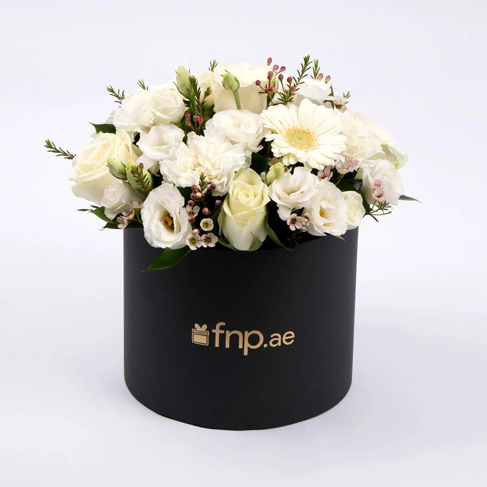 4 White Lisianthus Filler, 2 White Gerbera, 5 White Carnation Filler, 5 White Rose, 2 White Wax Filler, Green Ruscus Filler 1 Black Round Box, 2 Foam Oasis Local, 1 Gold Acrylic Sheet