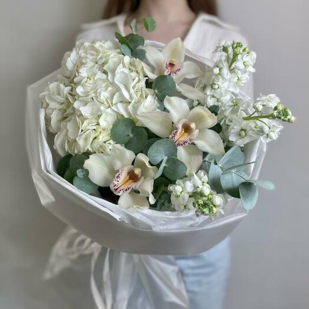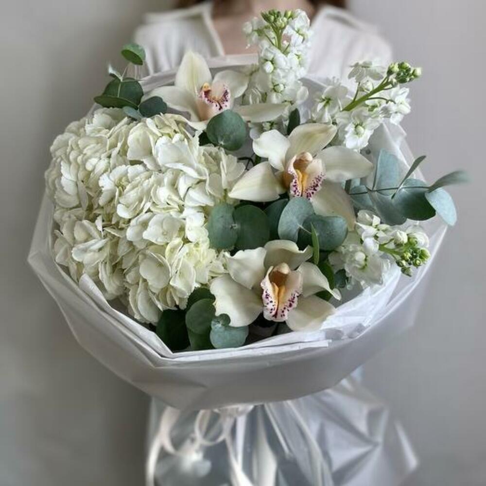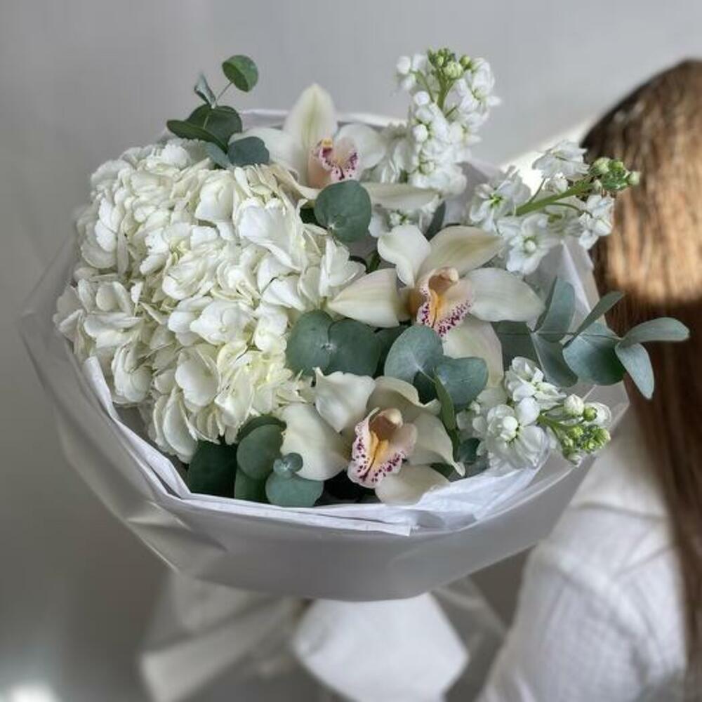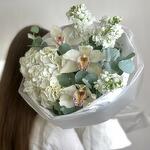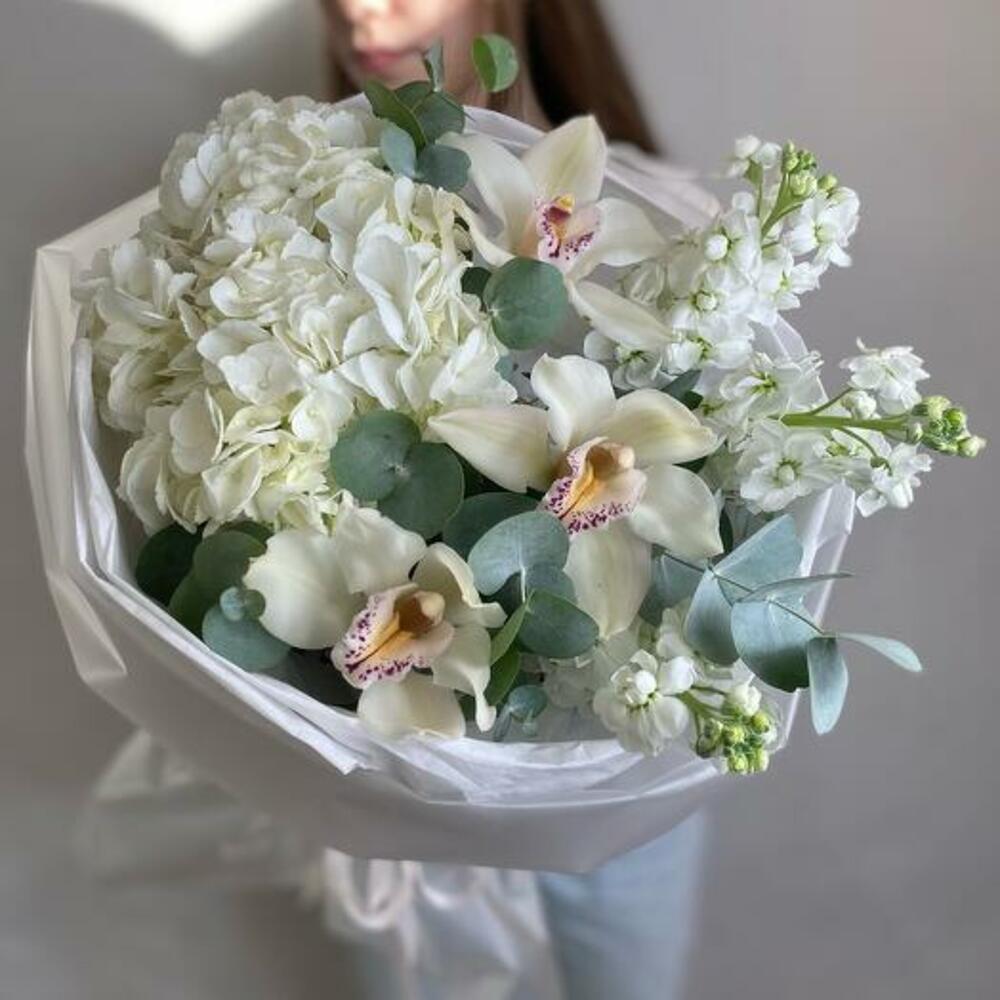 Eucalyptus - 3 pcs Cymbidium white - 3 pcs Pistachio - 2 pcs white hydrangea - 1 pcs design packaging - 4 pcs white matthiola - 3 pcs