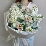Bouquet with white hydrangea, orchid and matthiola is an exquisite and refined combination of flowers that creates an elegant and exotic image. This bouquet will express your care and admiration, give joy and warmth to your loved ones and create an atmosphere of comfort and pleasure. Let this bouquet become a symbol of your love and devotion, emphasise the importance of the moment and decorate the day of a special person. Its exquisite beauty and wonderful fragrance will bring joy and pleasure not only on the day of the gift, but also for many years, leaving vivid memories and a sense of gratitude.