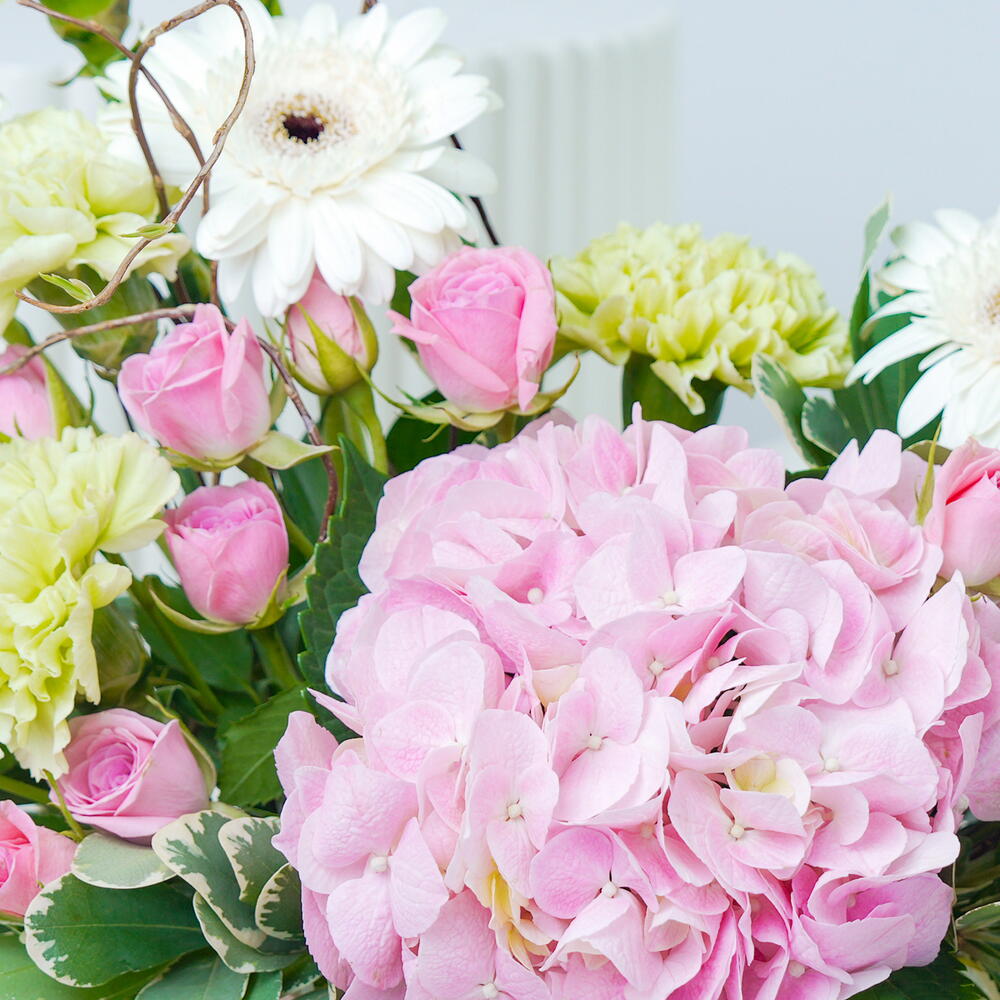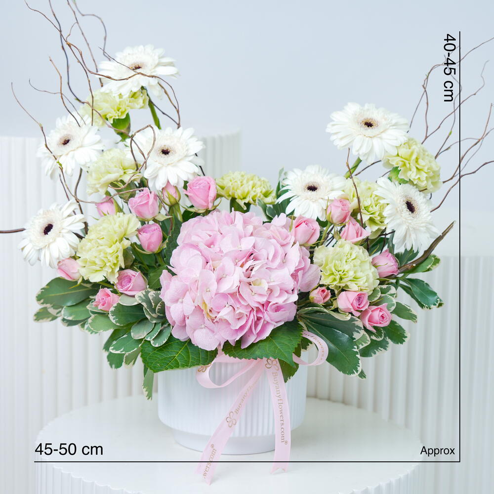 Dive into a mesmerizing world of colors with our Florists Special arrangement. Radiating an air of tender chic and elegance, it features one stunning hydrangea at center stage, surrounded by seven cheerful white gerberas and seven fragile yellow carnations. Interspersed are two stems of pink baby roses that add a romantic twist, while two stems each of Salix sticks, Pittosporum leaves, and Song of Jamaica leaves contribute luscious greenery. This spectacle of natures beauty is meticulously arranged in a sleek white ceramic pot. This exquisite blend of flowers and leaves creates a beautiful juxtaposition - a perfect addition to any home or office.