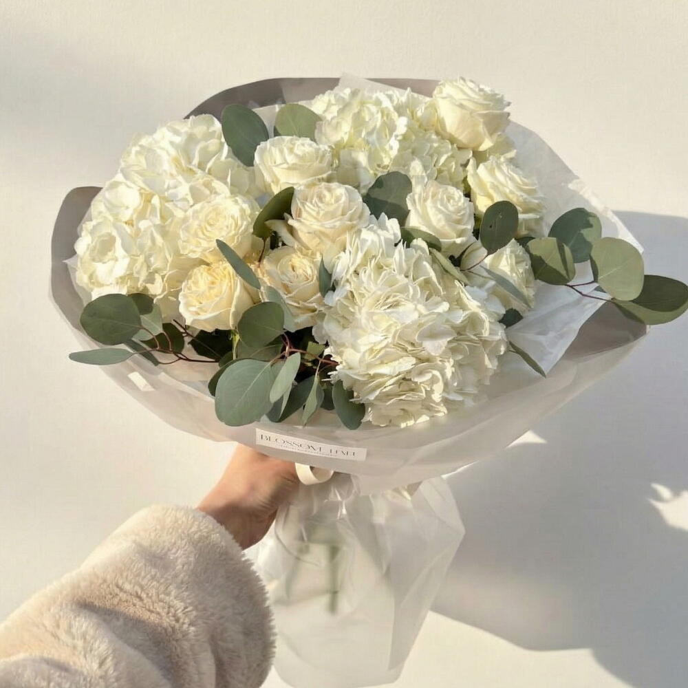 rose white - 10 pcs hydrangea white - 3 pcs ecualyptus - 3 pcs