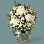 A harmonious blend of white hydrangeas and roses, arranged in a spherical glass vase, creating a balanced and visually appealing display.