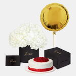 Delight someone special with our White Hydrangea in Box paired with a delicious cake bundle, creating a perfect gift that combines elegance, sweetness, and thoughtful celebration.