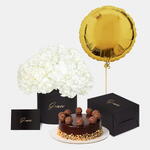Delight someone special with our White Hydrangea in Box paired with a delicious cake bundle, creating a perfect gift that combines elegance, sweetness, and thoughtful celebration.