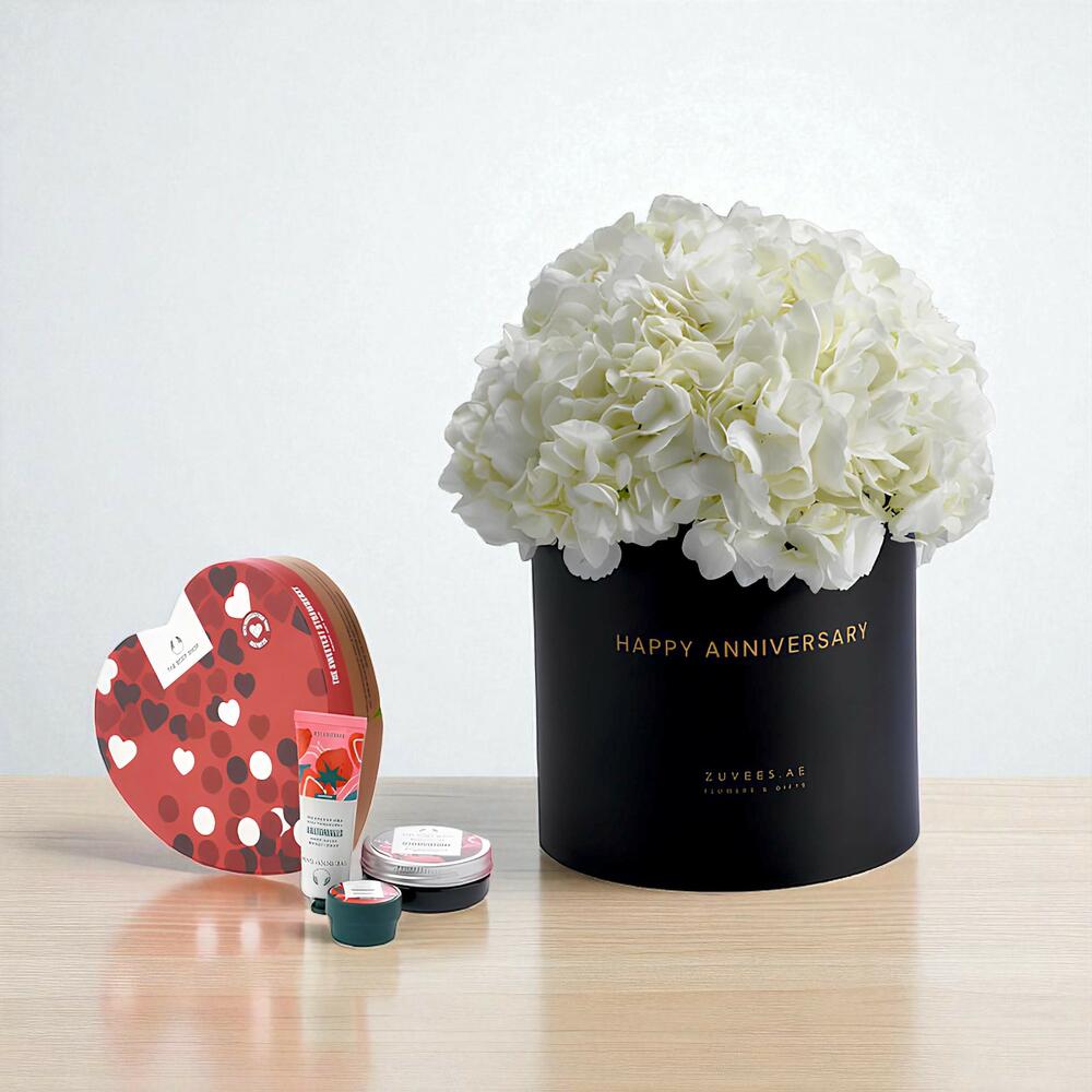 Celebrate love, purity, and sweet moments with the White Hydrangeas Strawberry Anniversary Gift Box — a graceful pairing that speaks of lasting affection. This elegant arrangement features 3 premium white hydrangeas, beautifully arranged in a luxurious ‘Happy Anniversary’ round box, symbolizing timeless elegance and devotion. To complete the gesture, it’s paired with The Body Shop’s ‘Sweetest Strawberry Heart’ Gift Box (hand cream, body butter, lip balm) — adding a charming and indulgent touch to this romantic set.