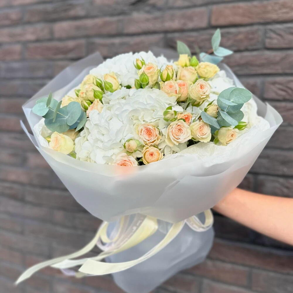 white hydrangia - 3 pcs spery pech roses - 5 pcs eucaley in a bqt - 3 pcs
