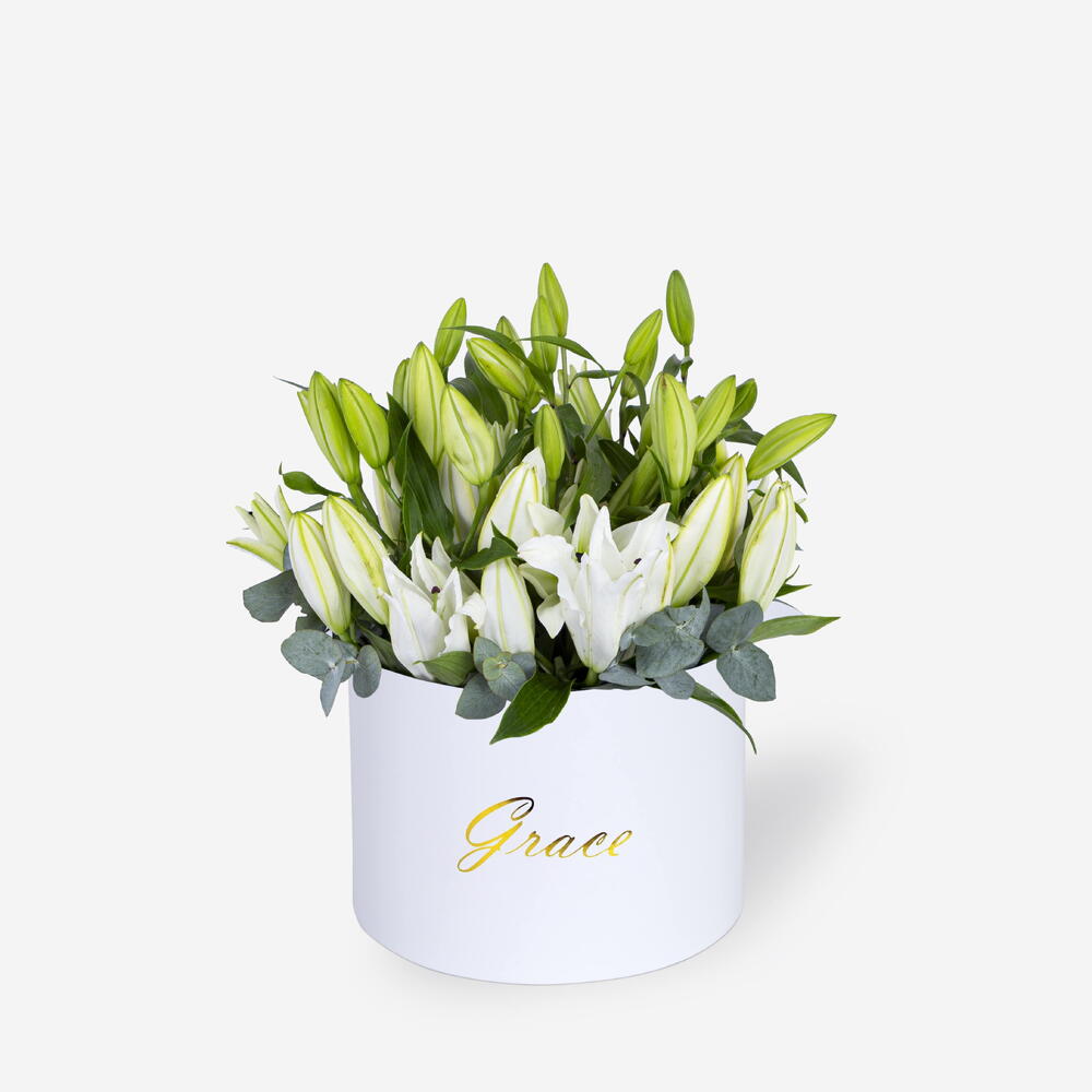 Lily White in Box is a stunning arrangement of pure white lilies, elegantly presented in a luxurious box, symbolizing grace, purity, and sophistication—perfect for any special occasion. Note: The lilies may not be fully open upon delivery, but the petals are expected to bloom beautifully within 2–3 days.