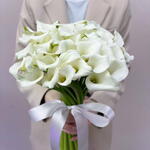 The bouquet features a central arrangement of white calla lilies (Zantedeschia aethiopica), which are known for their elegant, funnel-shaped flowersThe stems are wrapped tightly with a white ribbon or fabric.
