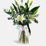 Brighten any space with this elegant White Lily in Vase arrangement, complemented by fresh eucalyptus. The pure white lilies symbolize purity and grace, while the eucalyptus adds texture and a soothing aroma. Perfect for gifting, celebrations, or adding a touch of sophistication and natural beauty to your home or office.