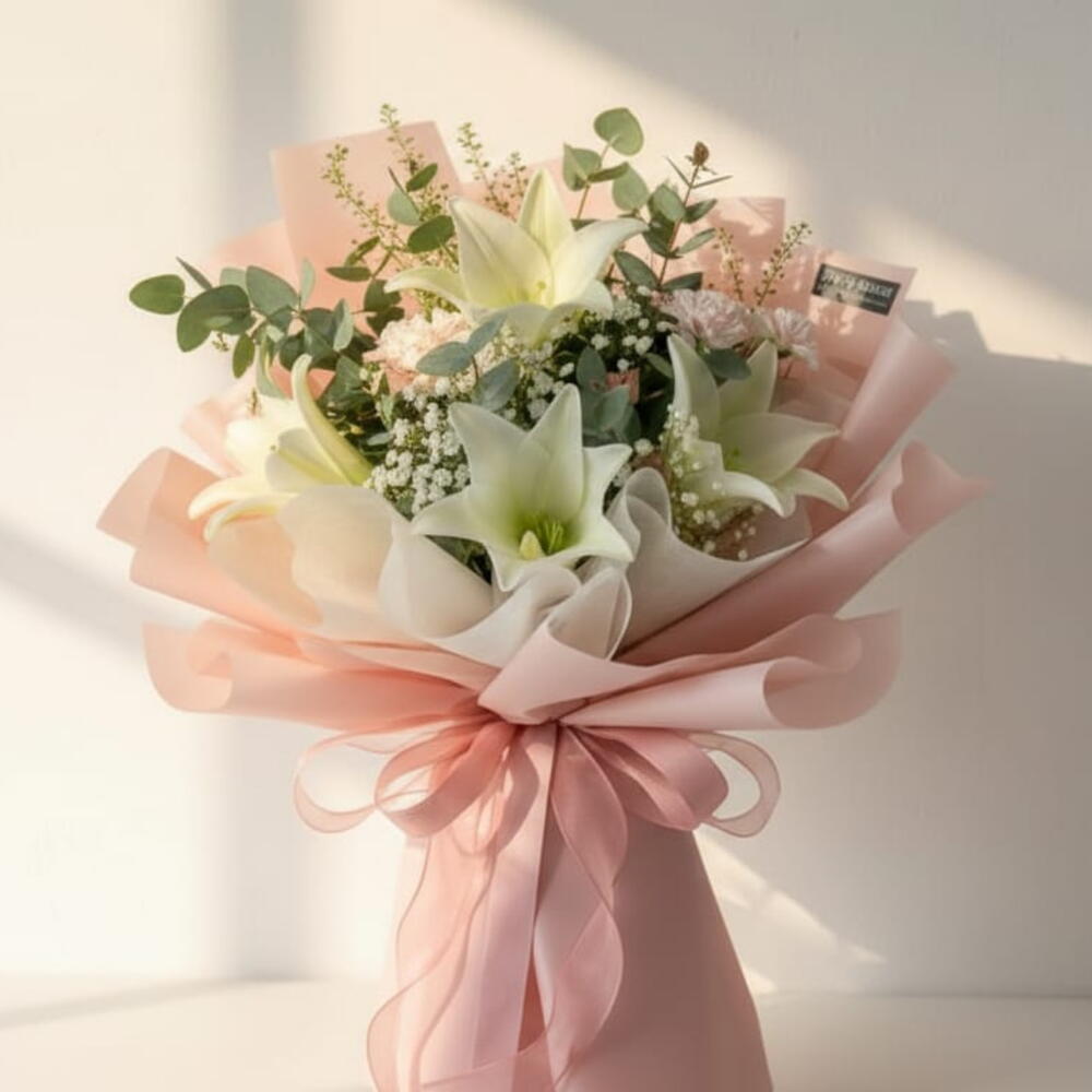 Delight Mom with our White Lily Light Pink Carnation Bouquet, featuring 4 graceful white lilies paired with 4 soft light pink carnations. Accented with 5 stems of airy gypsophila (baby’s breath) and 4 eucalyptus leaves for a fresh, garden-inspired finish. Perfect for Mother’s Day or thoughtful gifting, this bouquet radiates romance, elegance, and heartfelt appreciation. 🌸🤍🌿💖