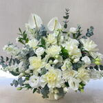Eucalyptus - 5 pcs White rose - 10 pcs lisianthus white - 4 pcs delphinium white - 4 pcs anthurium white - 2 pcs matthiola white - 5 pcs