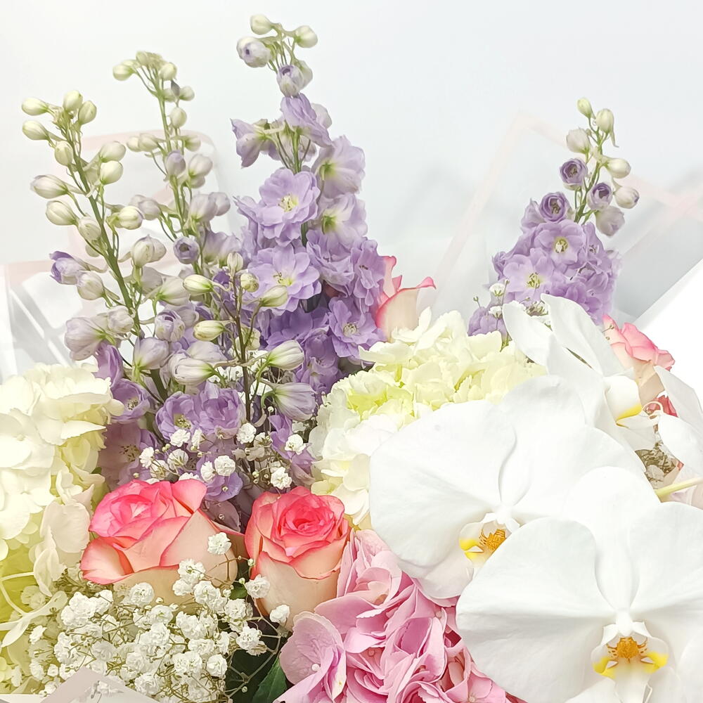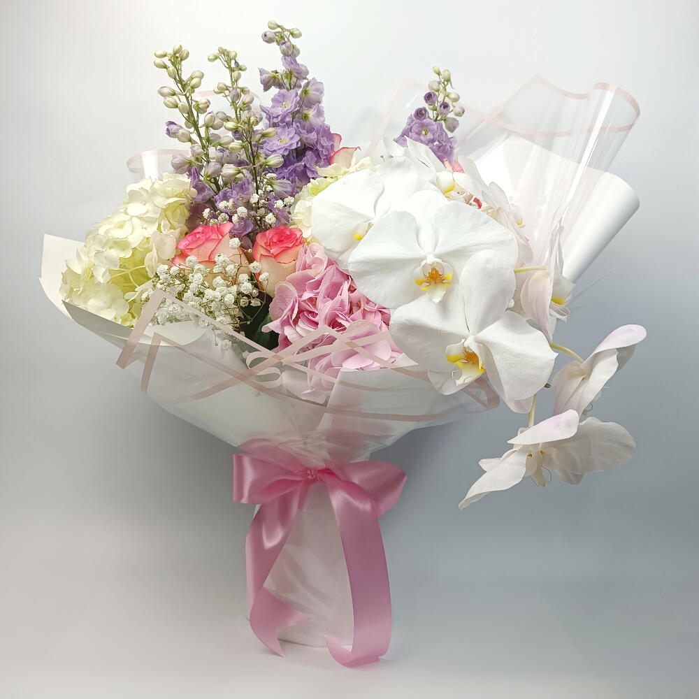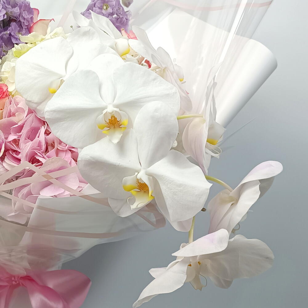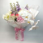hydrangea pink - 1 pcs hydrangea white - 2 pcs mathiola purple - 5 pcs rose jumilla - 5 pcs gysophilla white - 5 pcs phalaenopsis white - 1 pcs