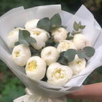 A graceful hand bouquet featuring 11 pristine white peonies beautifully paired with fresh eucalyptus stems. The peonies, known for their soft, full petals and elegant charm, symbolize purity, love, and new beginnings. The cool green eucalyptus adds texture, fragrance, and a modern touch, creating a naturally luxurious look. Wrapped in minimal, classy packaging, this bouquet makes a perfect gift for birthdays, anniversaries, or special celebrations, expressing heartfelt emotions with timeless beauty and sophistication.