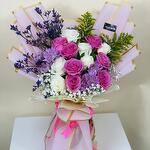 Limonium - 2 pcs Chrysanthemum - 2 pcs Solidago - 2 pcs Gypsophila - 2 pcs mix roses - 13 pcs
