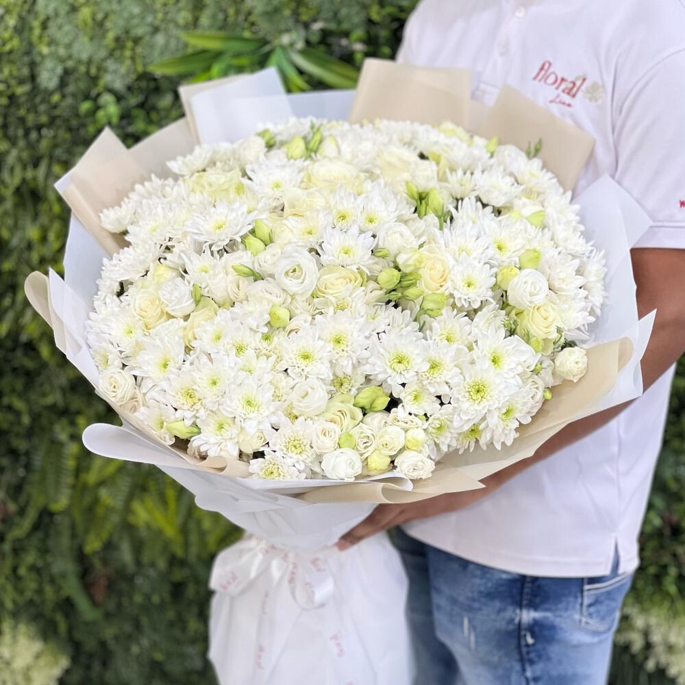 white lisianthus - 18 pcs white chrysanthemum spray - 25 pcs white roses - 14 pcs