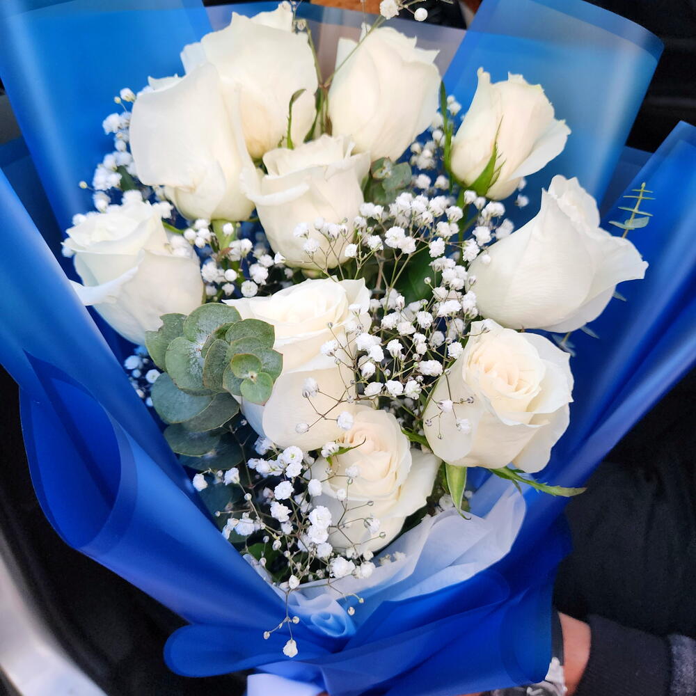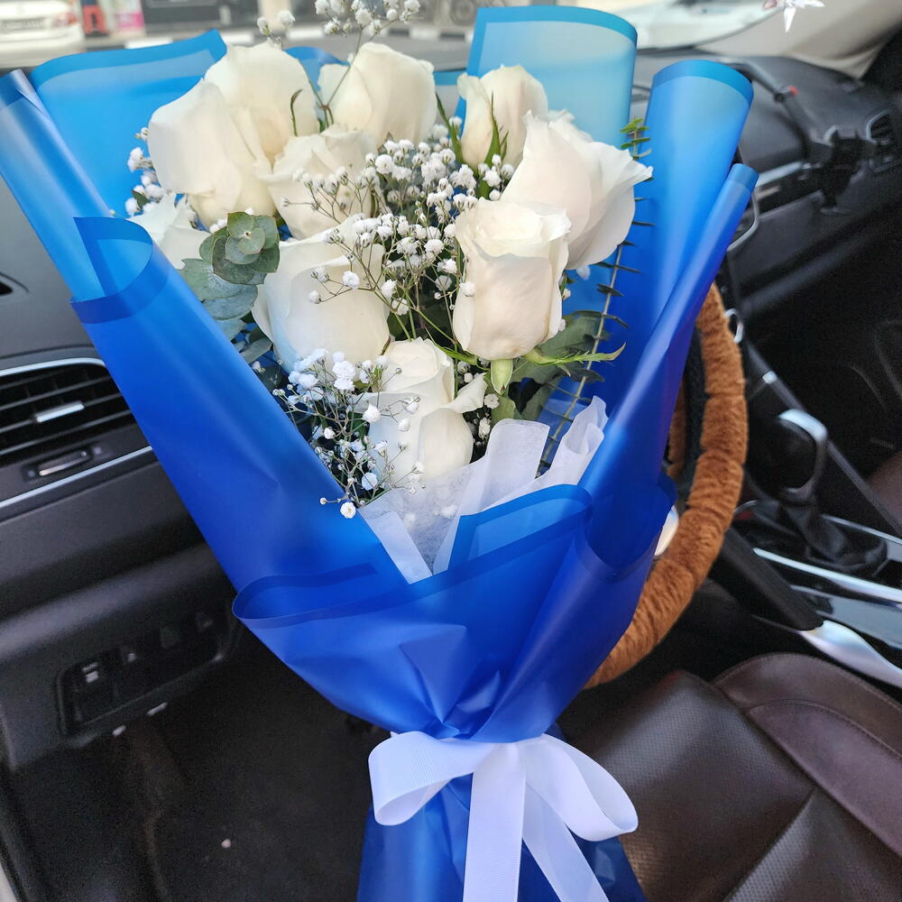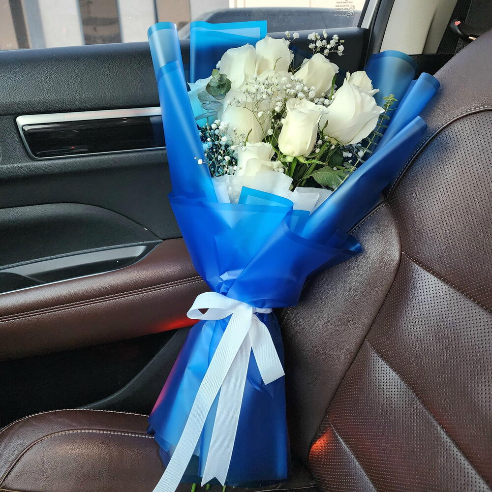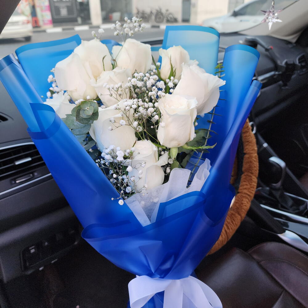 Surprise your loved ones with this elegant white rose bouquet wrapped in blue. Idea for all occasions. flowers UAE bouquet Dubai flower delivery UAE roses Dubai gifts UAE flower delivery Abu Dhabi Same day Valentine flowers UAE