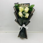 4 White Roses with Ruscus and Gypsophila in Black Wrapping.