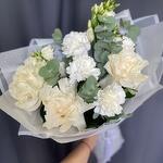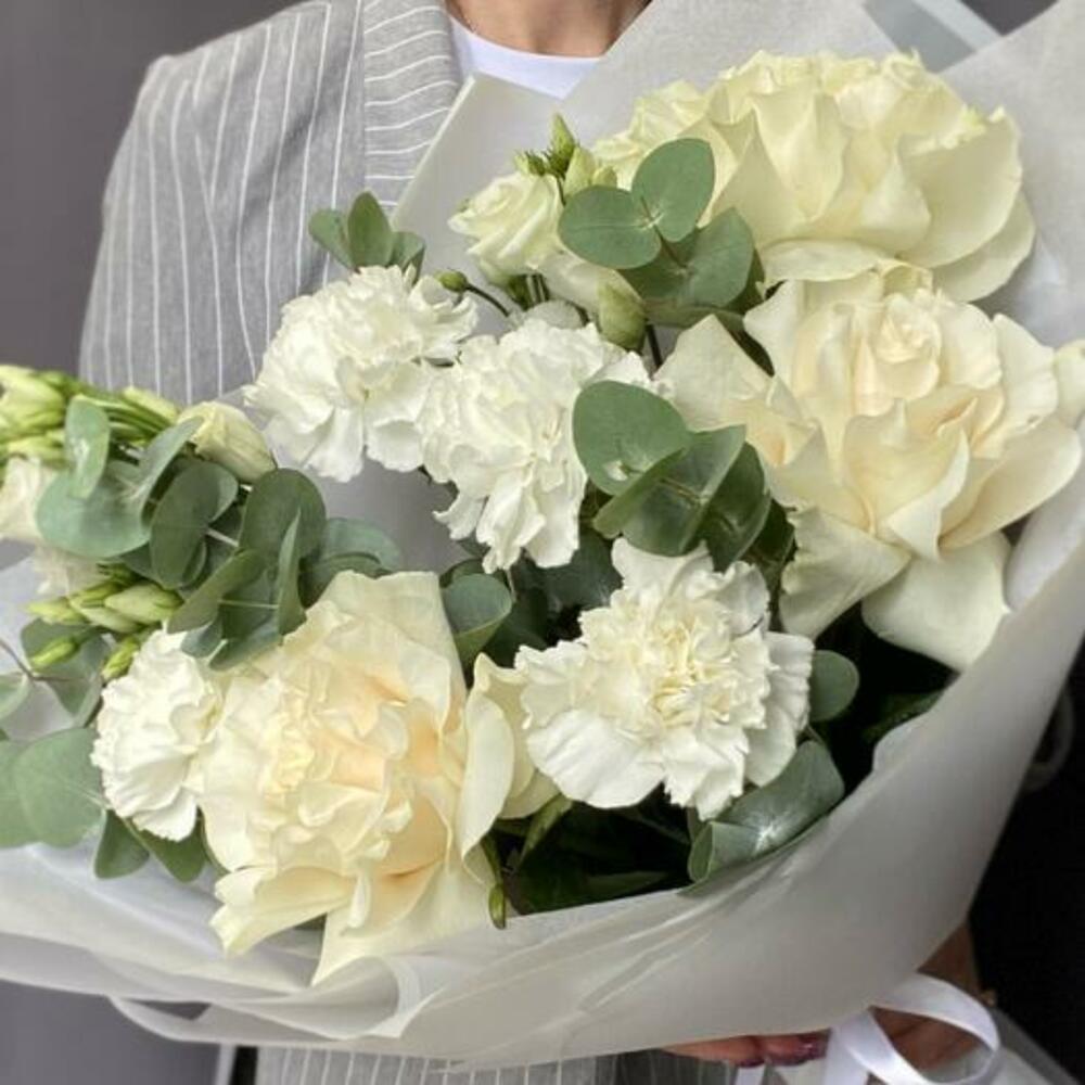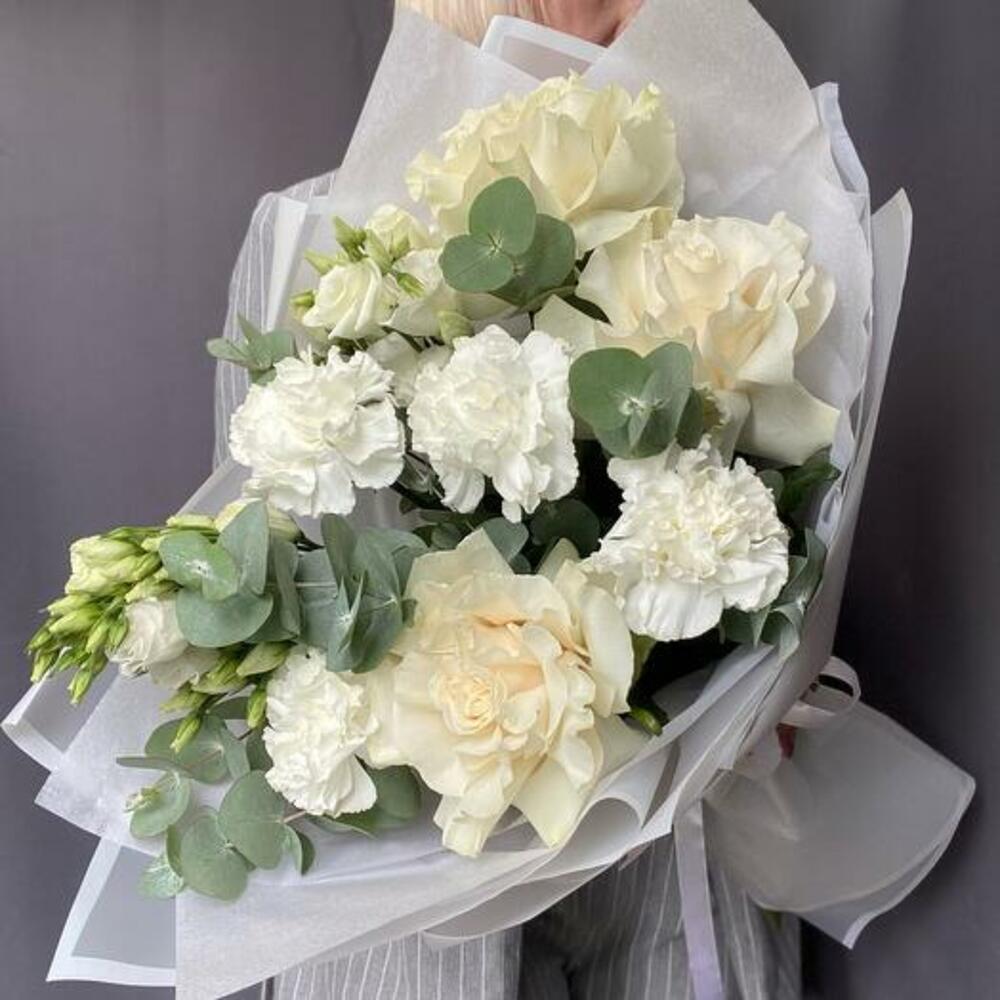 Experience the epitome of elegance with our sophisticated white bouquet. Featuring lush eucalyptus, delicate lisianthus, three pristine roses, and charming dianthus, this arrangement embodies purity and grace. Each element is carefully selected and artfully arranged to create a harmonious blend of textures and shades. Finished with a luxurious satin ribbon, this bouquet is perfect for weddings, anniversaries, or any special occasion where you wish to convey timeless beauty and refinement.