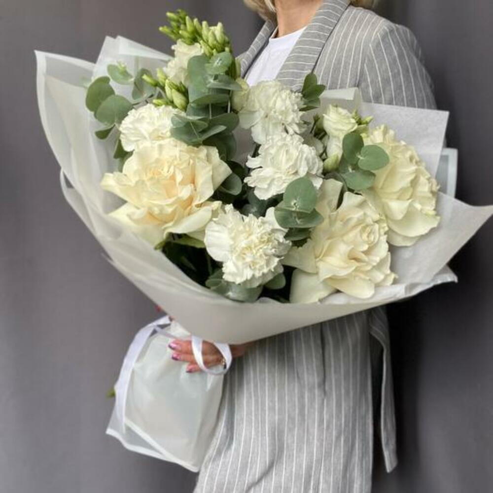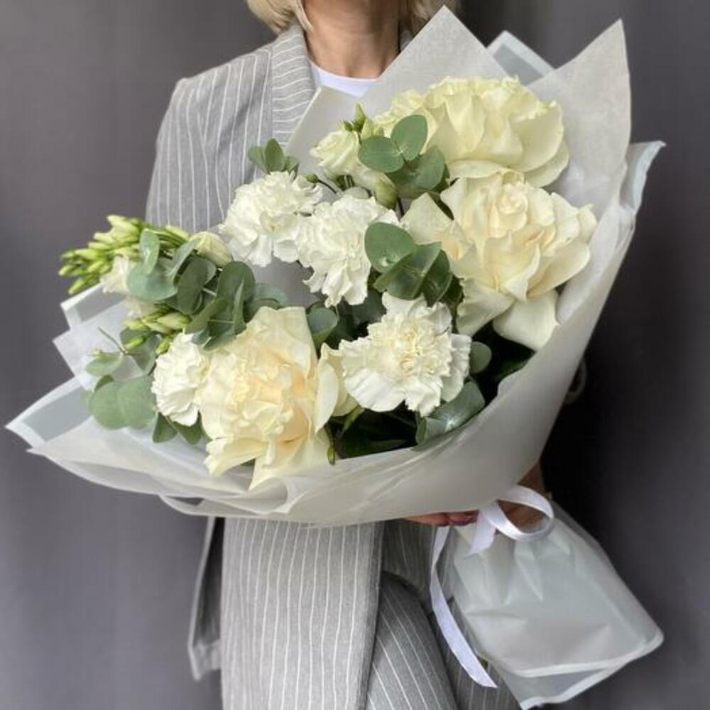 Experience the epitome of elegance with our sophisticated white bouquet. Featuring lush eucalyptus, delicate lisianthus, three pristine roses, and charming dianthus, this arrangement embodies purity and grace. Each element is carefully selected and artfully arranged to create a harmonious blend of textures and shades. Finished with a luxurious satin ribbon, this bouquet is perfect for weddings, anniversaries, or any special occasion where you wish to convey timeless beauty and refinement.