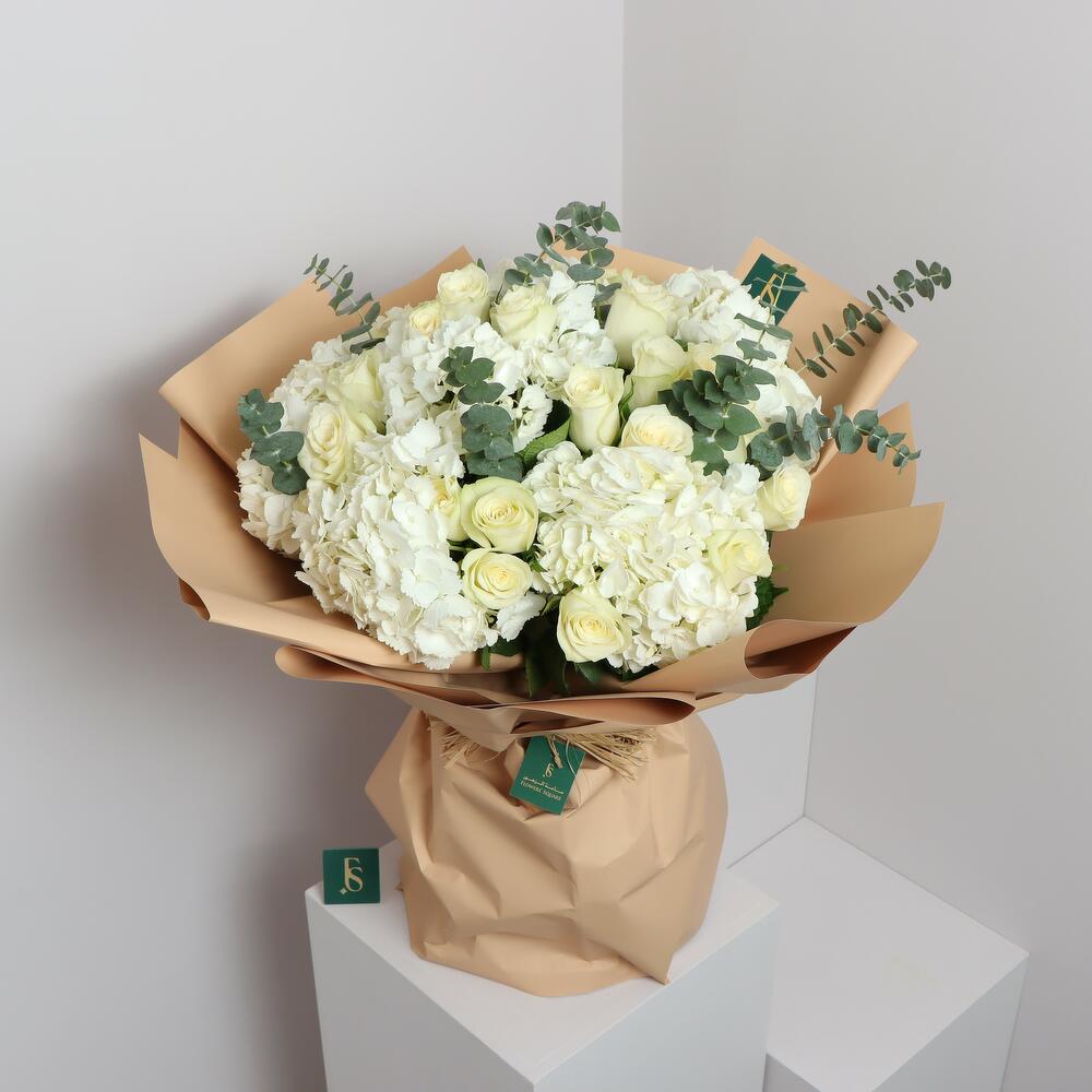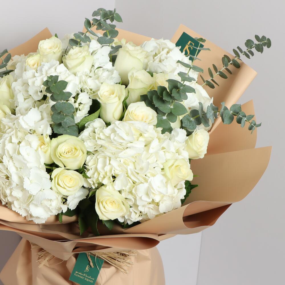 Introducing the stunning "White Roses & Hydrangea" bouquet - a beautiful arrangement that exudes grace, elegance, and sophistication. This bouquet features a carefully curated selection of the finest white roses and hydrangeas, arranged in a lush and bountiful display. The contrasting textures of the roses and hydrangeas work together harmoniously, creating a visually stunning arrangement that is sure to impress.