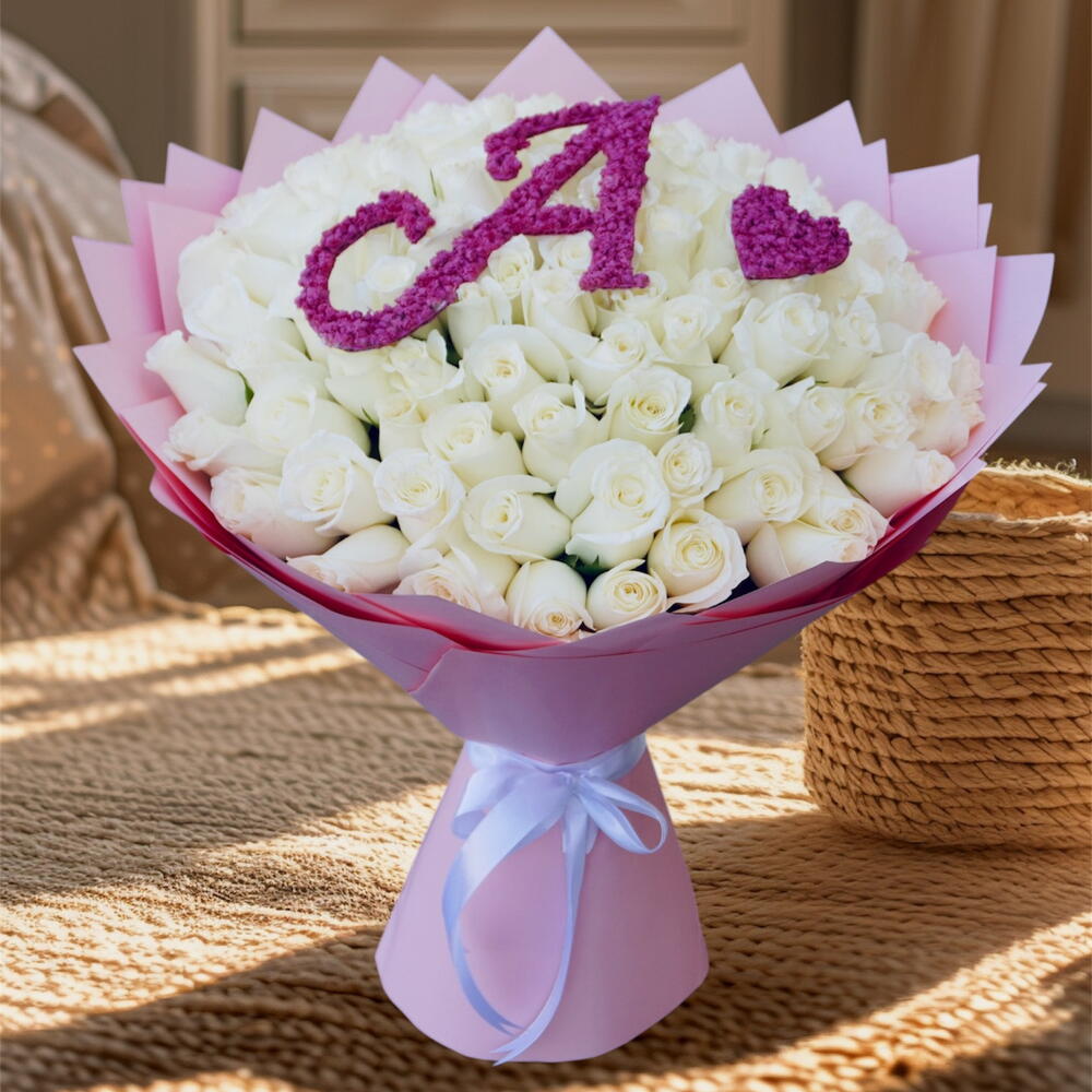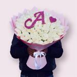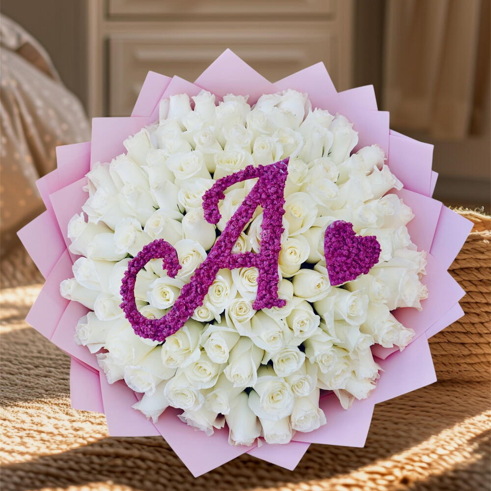 Immerse in the purity of affection with this Mono Bouquet featuring 101 handpicked white roses, elegantly bundled together with a hint of grace. Wrapped in a delicate light pink cover interspersed with eight pieces, this bouquet is exquisitely adorned with a single white ribbon that adds a rich contrast. Adding a personalized touch, it comes with a customizable name letter. A small heart adds just the right amount of magic, making the bouquet a perfect expression of your heartfelt sentiments. Timeless and classic, it surely will become a delightful memory for your loved one.