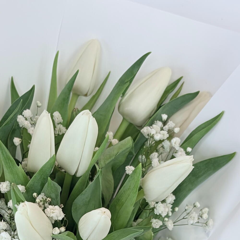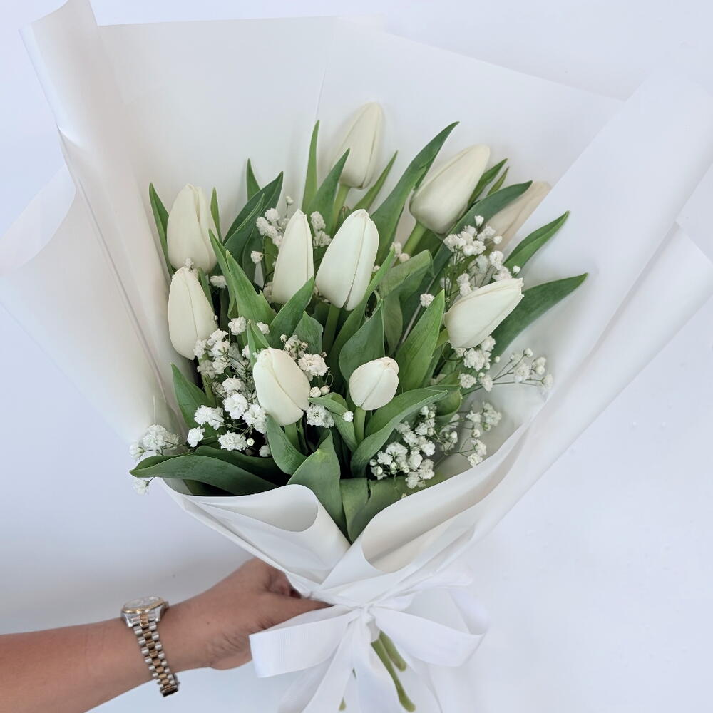 Experience the beauty of simplicity with our collection. This stunning monochromatic arrangement features 10 premium white tulips, known for their symbol of deep love and new beginnings. Nestled among delicate clouds of white gypso and wrapped in crisp, layered white Korean-style paper, this bouquet offers a serene and high-end aesthetic.