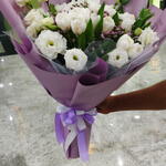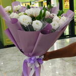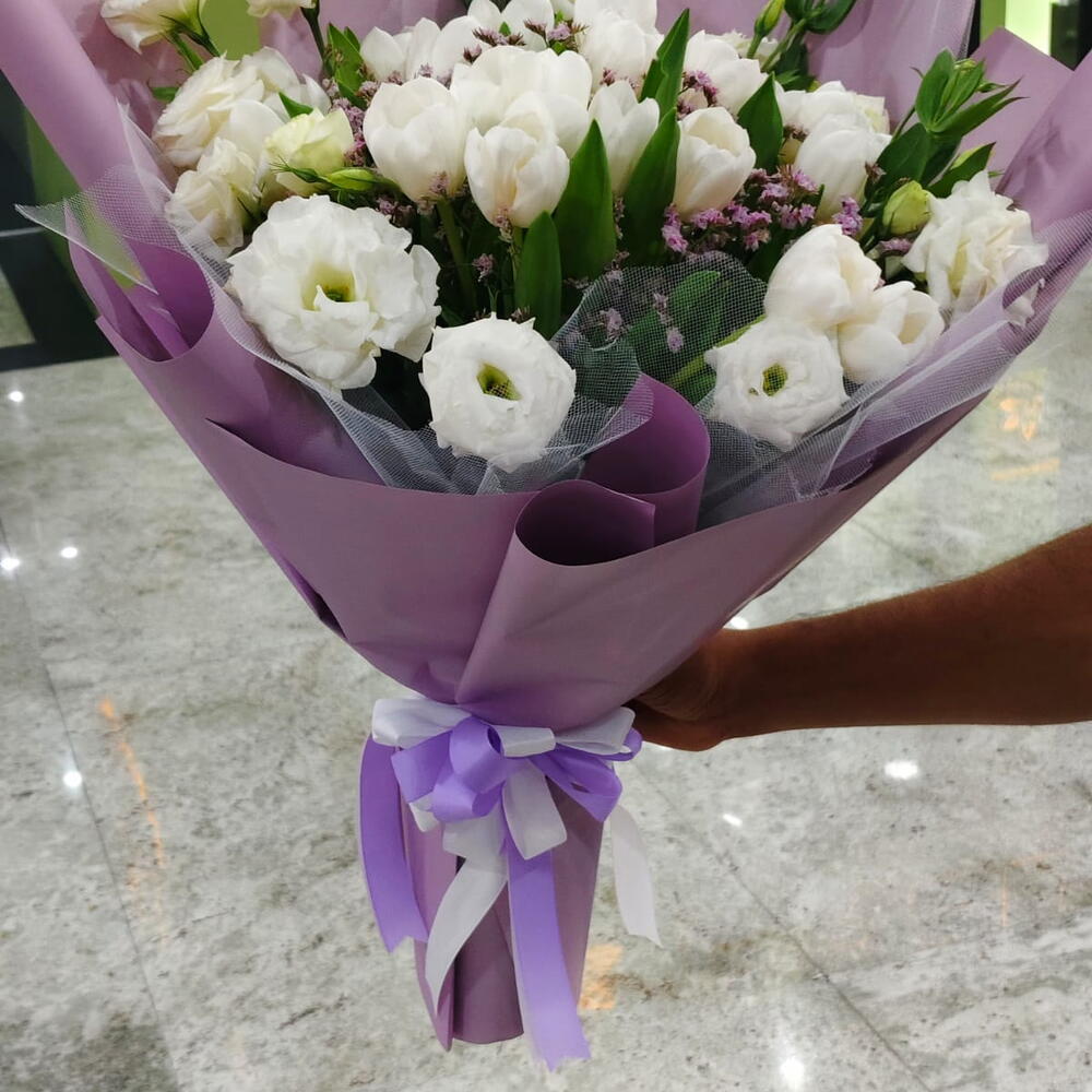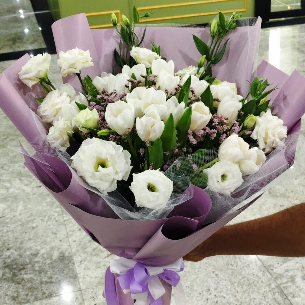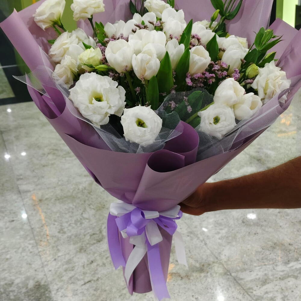 tulips white - 15 pcs limonium pink - 4 pcs lesianthus white - 6 pcs