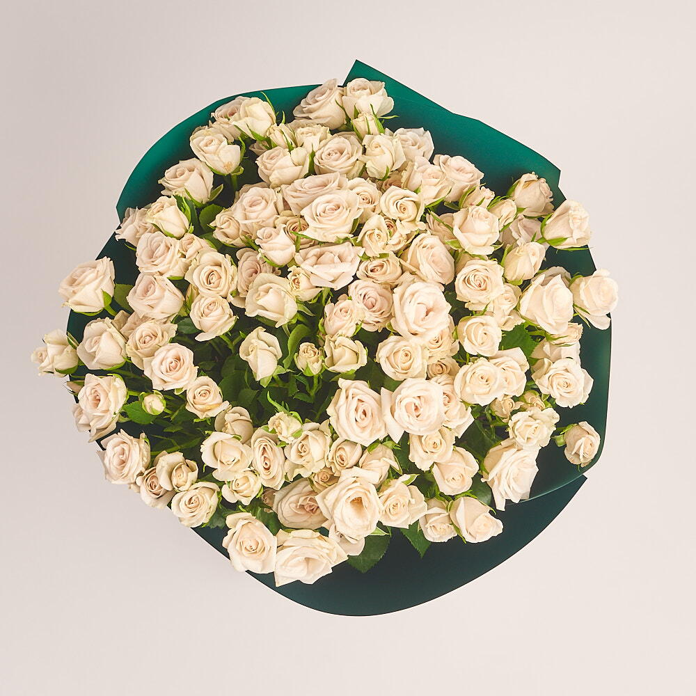A luxurious and refreshing bouquet of 69 white spray roses, elegantly arranged and wrapped in rich emerald green premium wrap for a bold yet graceful finish. Each stem carries multiple delicate blooms, creating a full, airy look that feels both modern and timeless. This refined arrangement is perfect for weddings, nikah ceremonies, engagements, congratulations, or sophisticated gifting. The white spray roses symbolize purity, peace, and new beginnings, while the emerald green wrap adds a touch of elegance and prosperity—making it an ideal choice for meaningful and memorable occasions. 🤍🌿