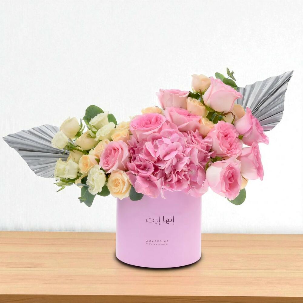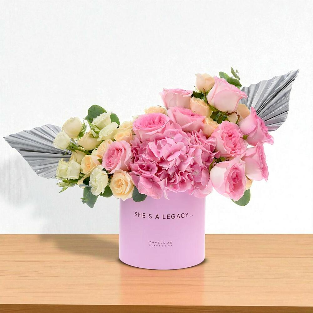 Elegance finds its perfect form in the Wings of Silver Legacy Box — a graceful bloom box designed to celebrate feminine strength and enduring beauty. Blushing pink roses and soft peach accents blend harmoniously with creamy whites and silver-painted foliage, creating a poetic expression of admiration, gratitude, and grace. A tribute to legacies that inspire, this box is a heartfelt way to say: you are remembered, cherished, and celebrated.