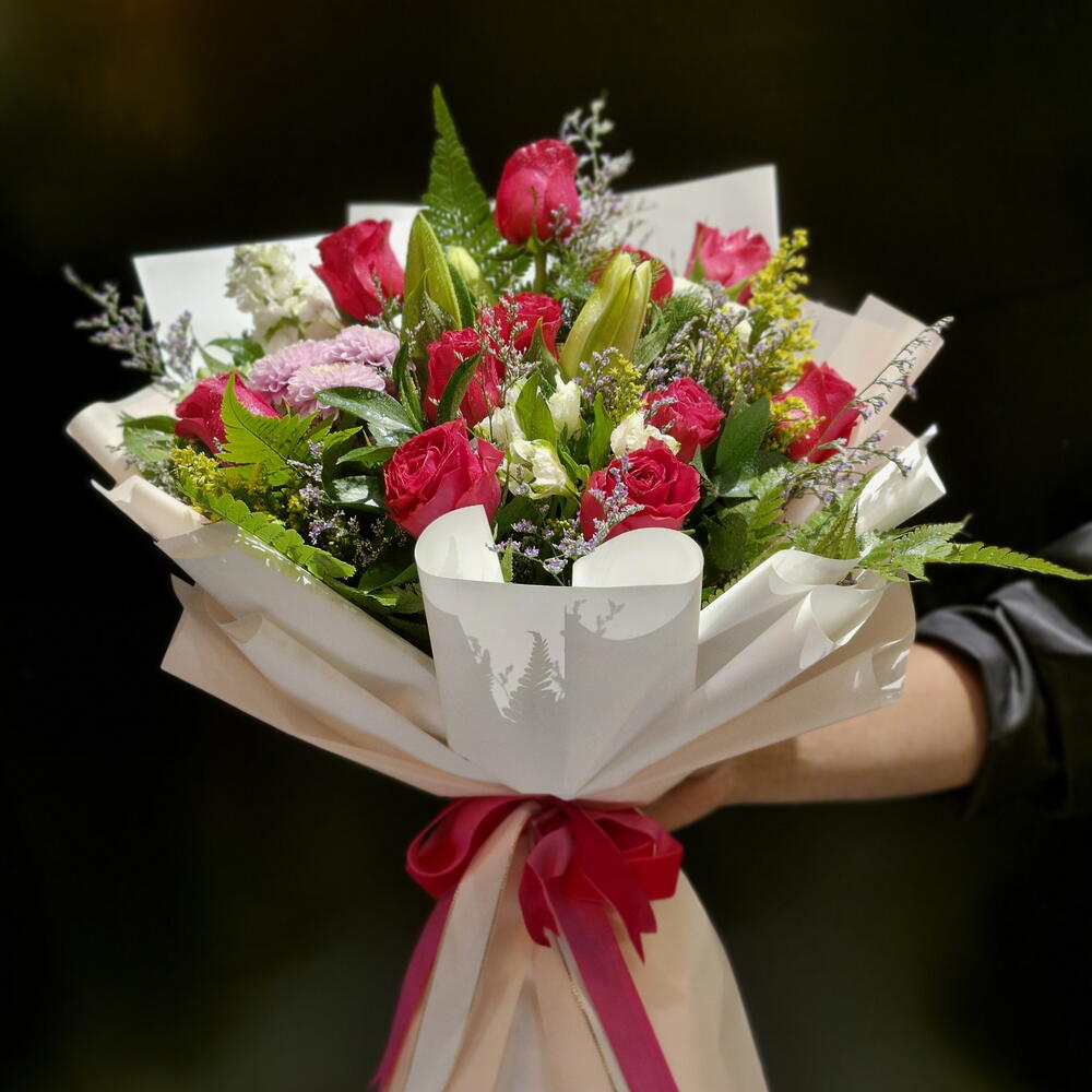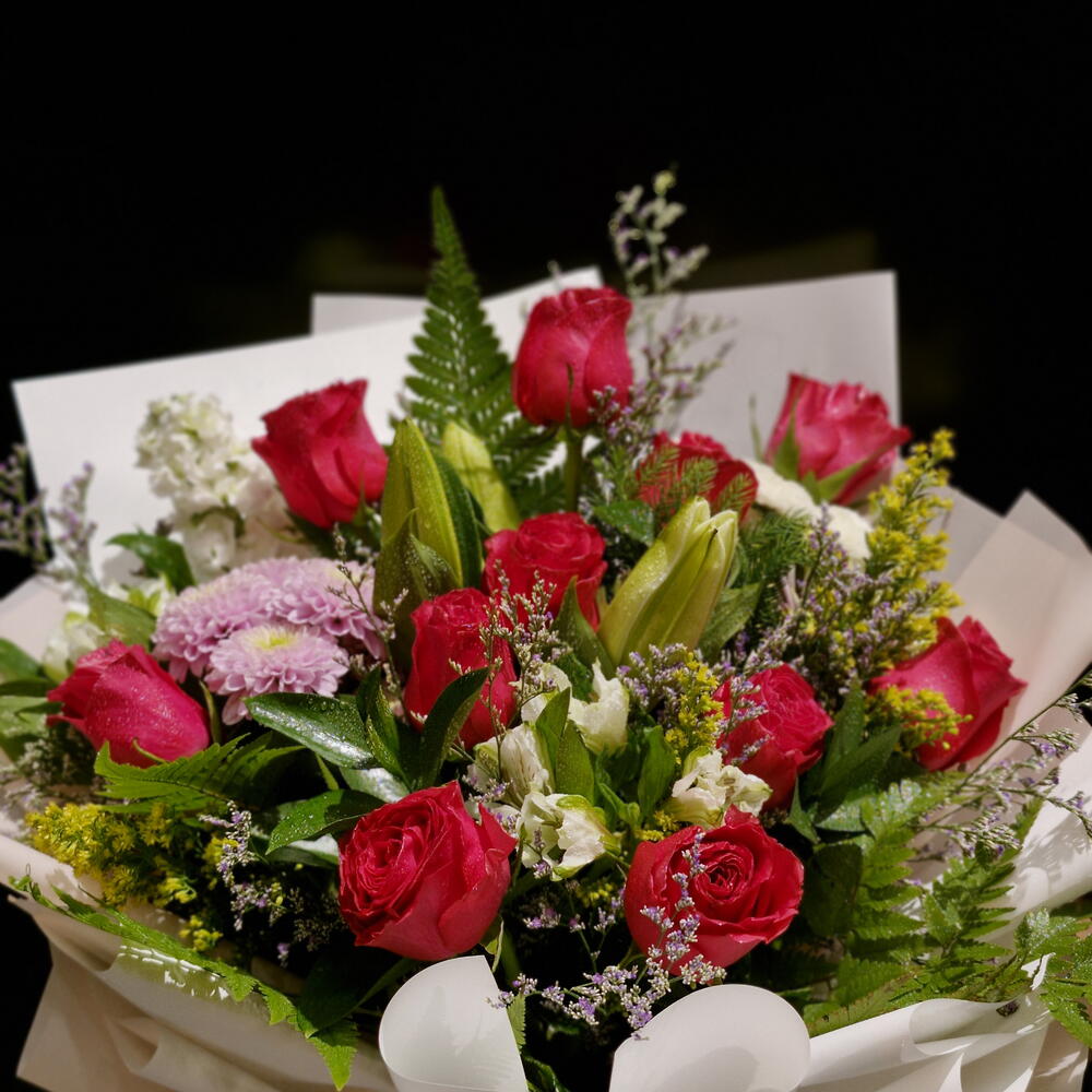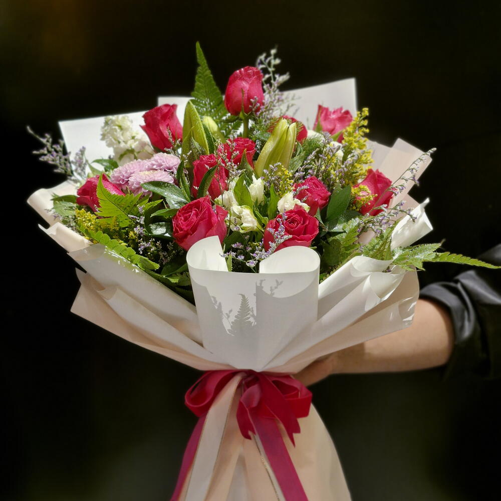 Red rose - 10 pcs ruscus leaves - 5 pcs santini chrysanthemums - 2 pcs leather leaf - 4 pcs astromelia - 2 pcs lilly white - 2 pcs mithiola - 2 pcs