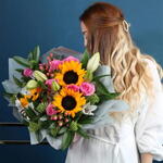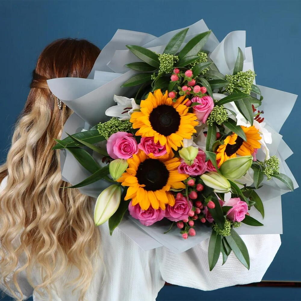 Flower types: Pink Roses, Sun Flowers, Skimmia Kew, Limonium flower and Hypericum. Packaging: Silver Wrapper. Care instructions: Change the water daily, preferably placed in a cool place.