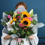 sunflowers - 3 pcs hypericum - 7 pcs pink roses - 7 pcs white lili - 9 pcs