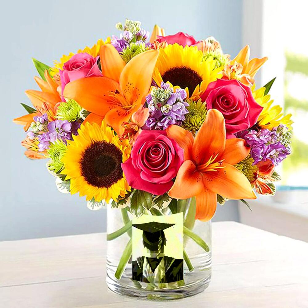 "Product Details: 6 Dark Pink Roses 5 Purple Matthiola 3 Stems Of Orange Lilies 5 Sunflowers 4 Stems Of Orange Alstroemeria 2 Stems Of Green Button Chrysanthemum Pittosporum Leaves Round Glass Vase - 12X15Cms"