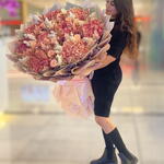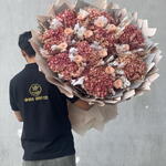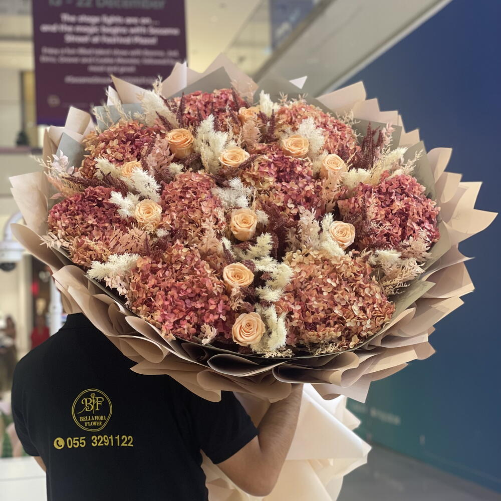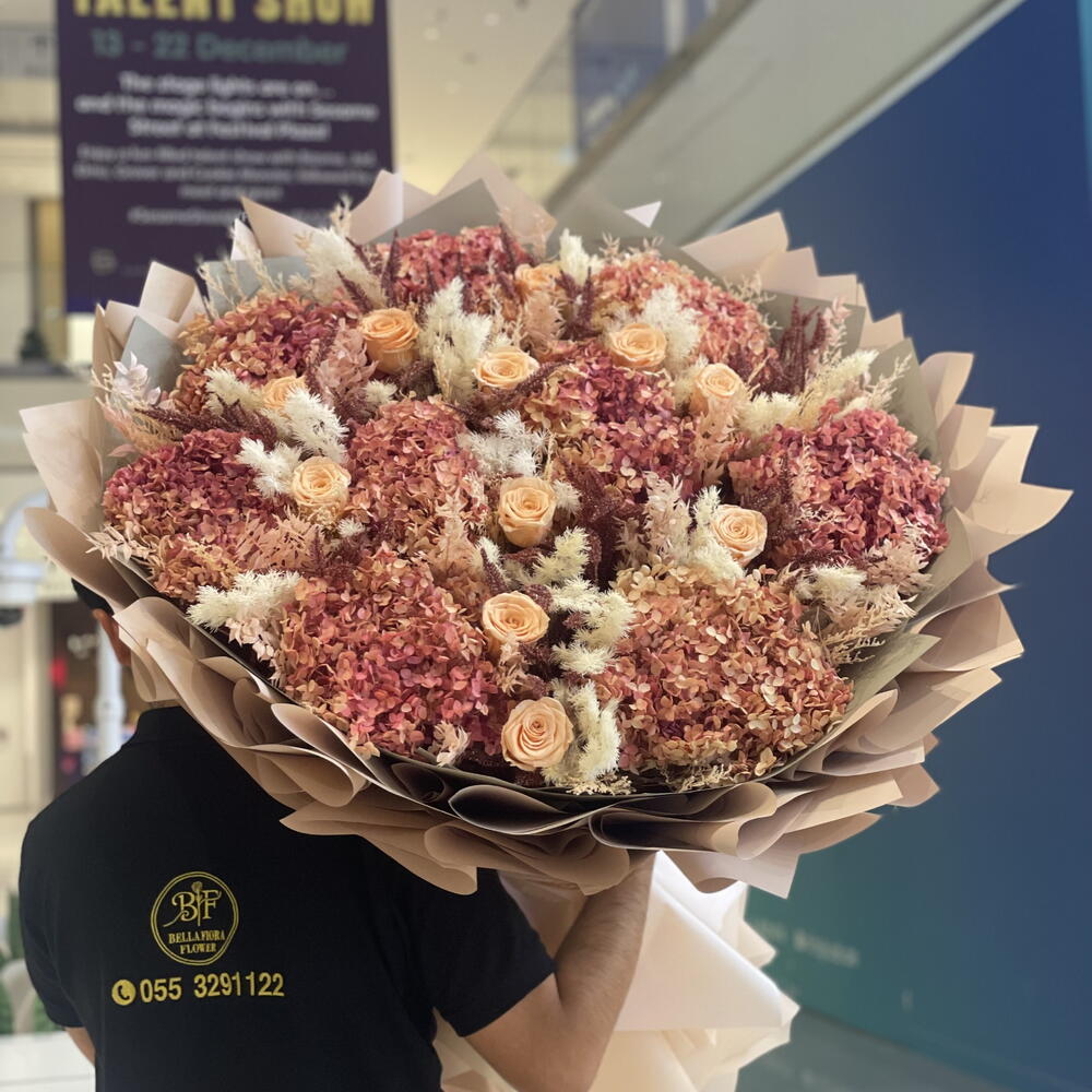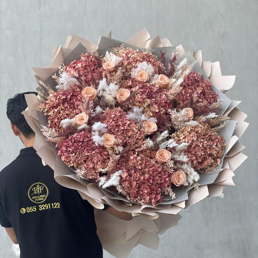 Ribbon - 1 pcs Wrapping - 40 pcs rose - 10 pcs dry hydrangea - 7 pcs dried pumps - 10 pcs dried aspirgus - 10 pcs dried eucliptus - 10 pcs