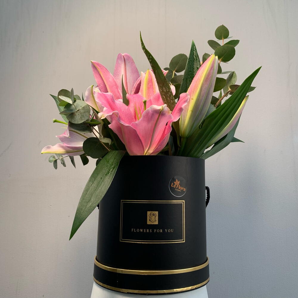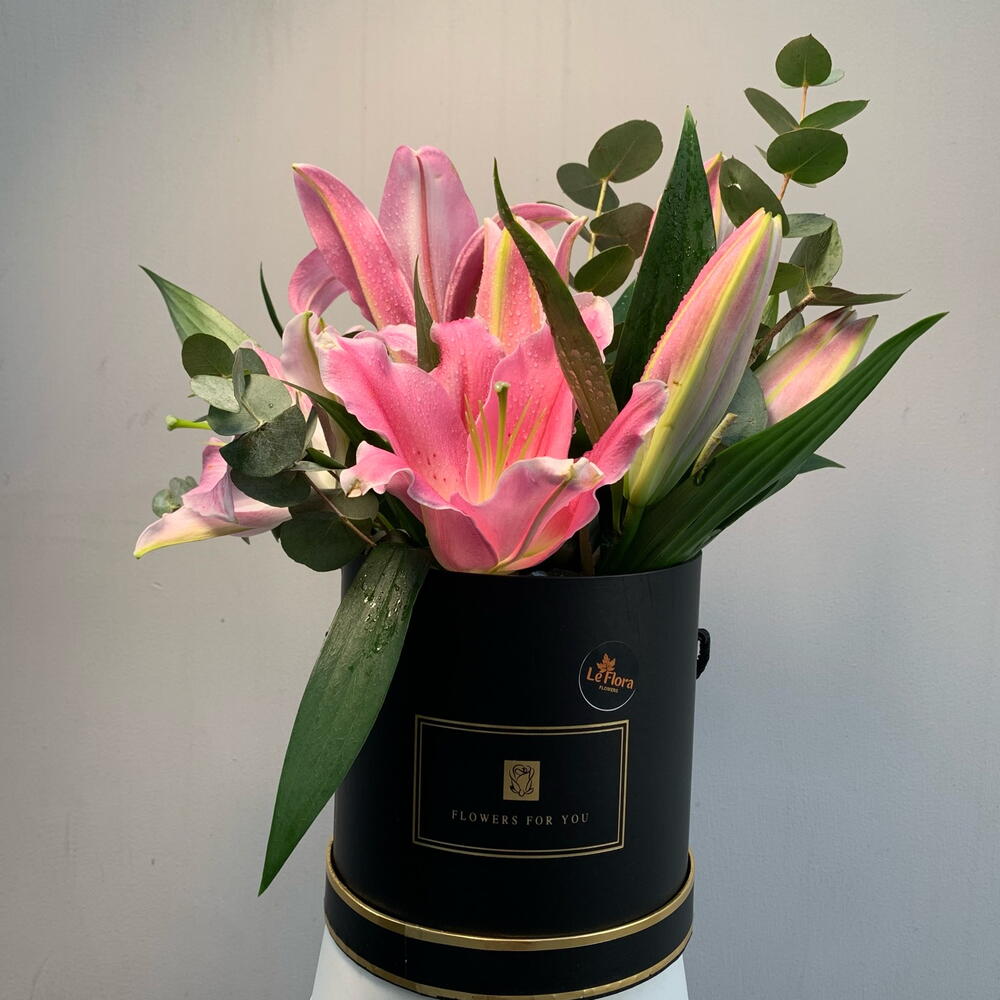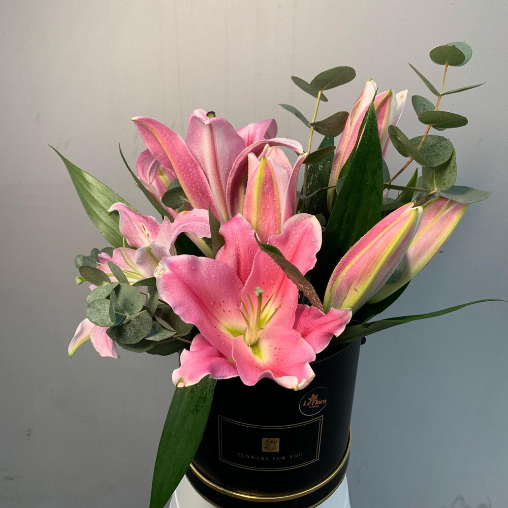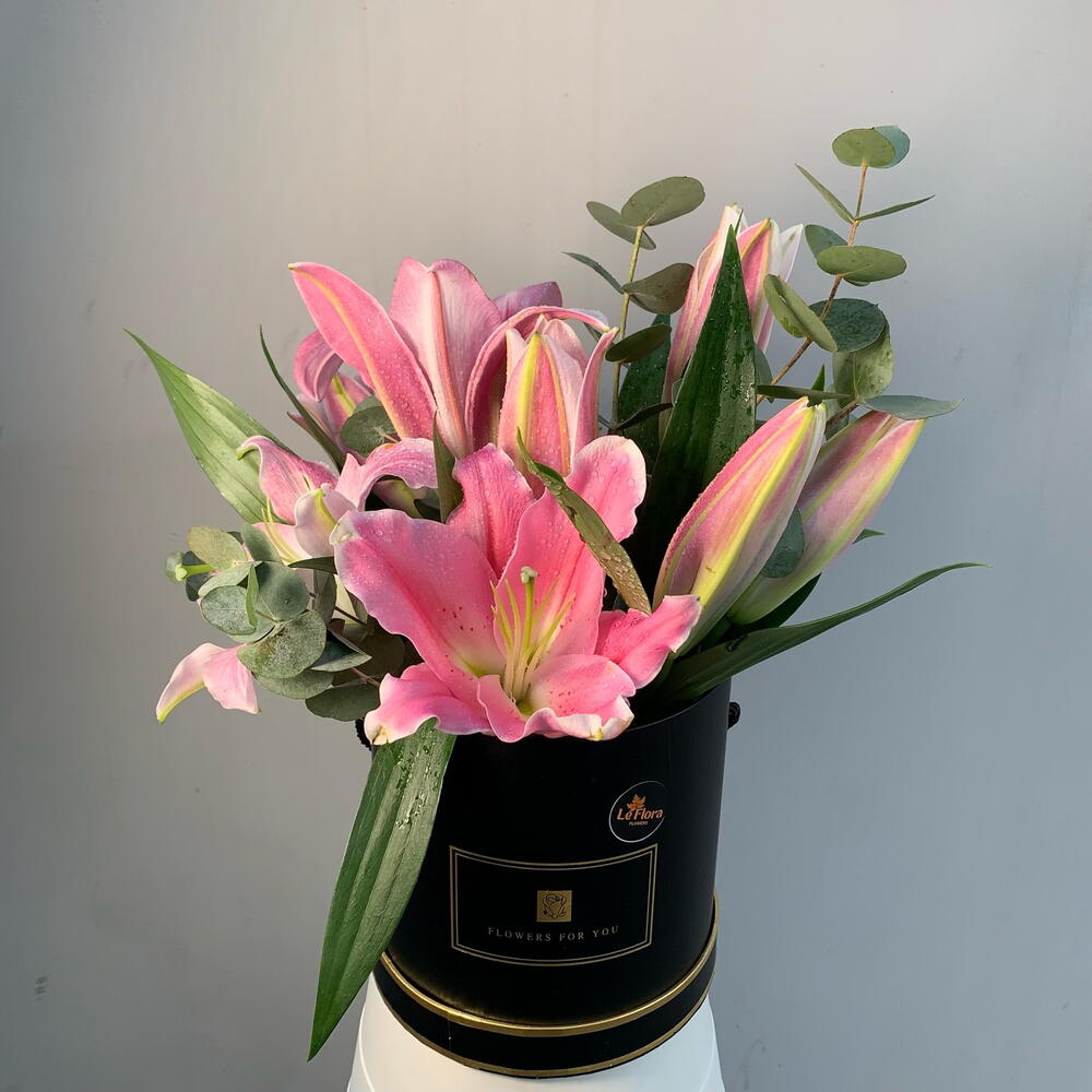 rose - 3 pcs pink lilies - 3 pcs eucalyptus leaves - 5 pcs