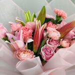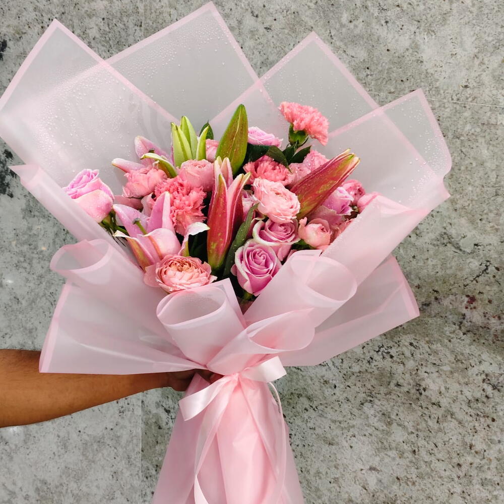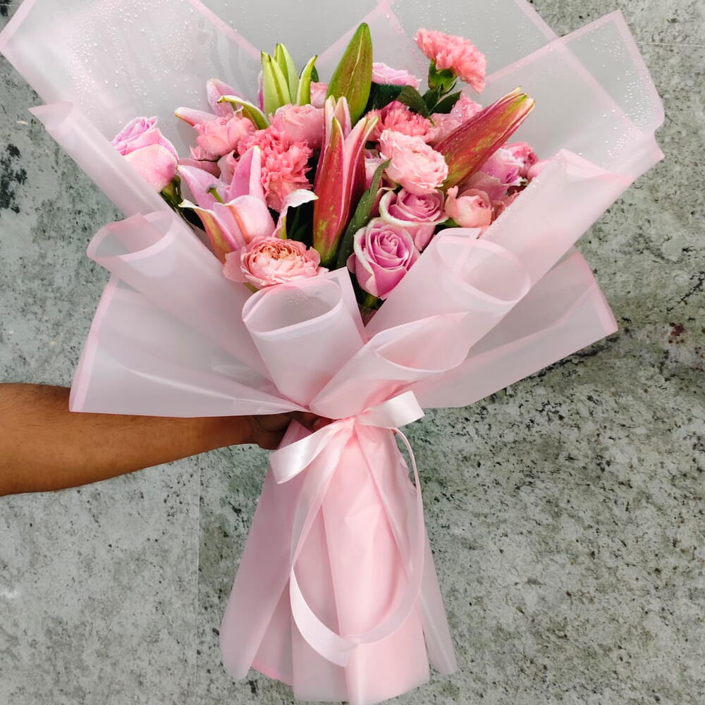 rose pink - 5 pcs carnation pink - 4 pcs lily pink - 2 pcs garden spray rose pink - 2 pcs