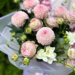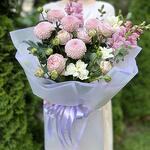 Composition: Chrysanthemum Momoko - 5, Antirrinum - 2, Freesia - 3, Rose spray Rich Babels - 3, Eucalyptus - 1, wrapping - 4, ribbon - 1 Sizes: WIDTH - 45CM; HEIGHT - 60CM; LENGTH - 60CM; (including packaging) Size: 45 x 60 x 60 cm