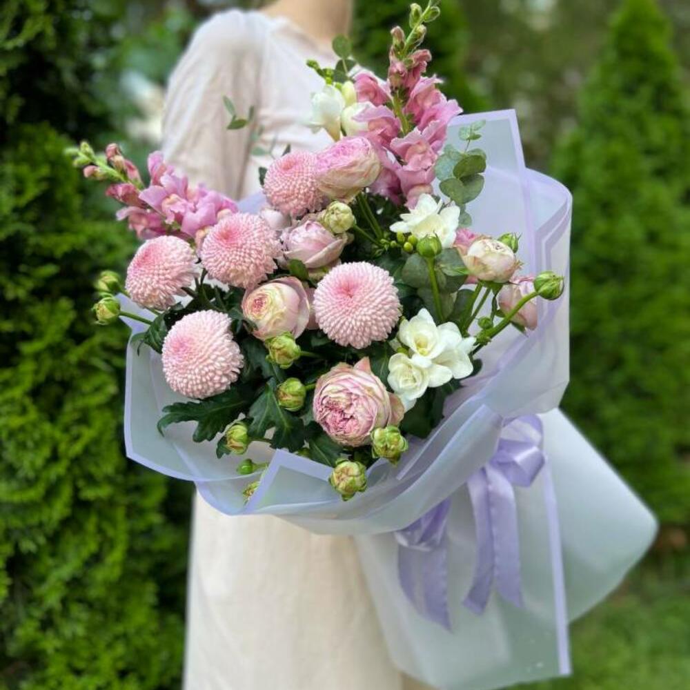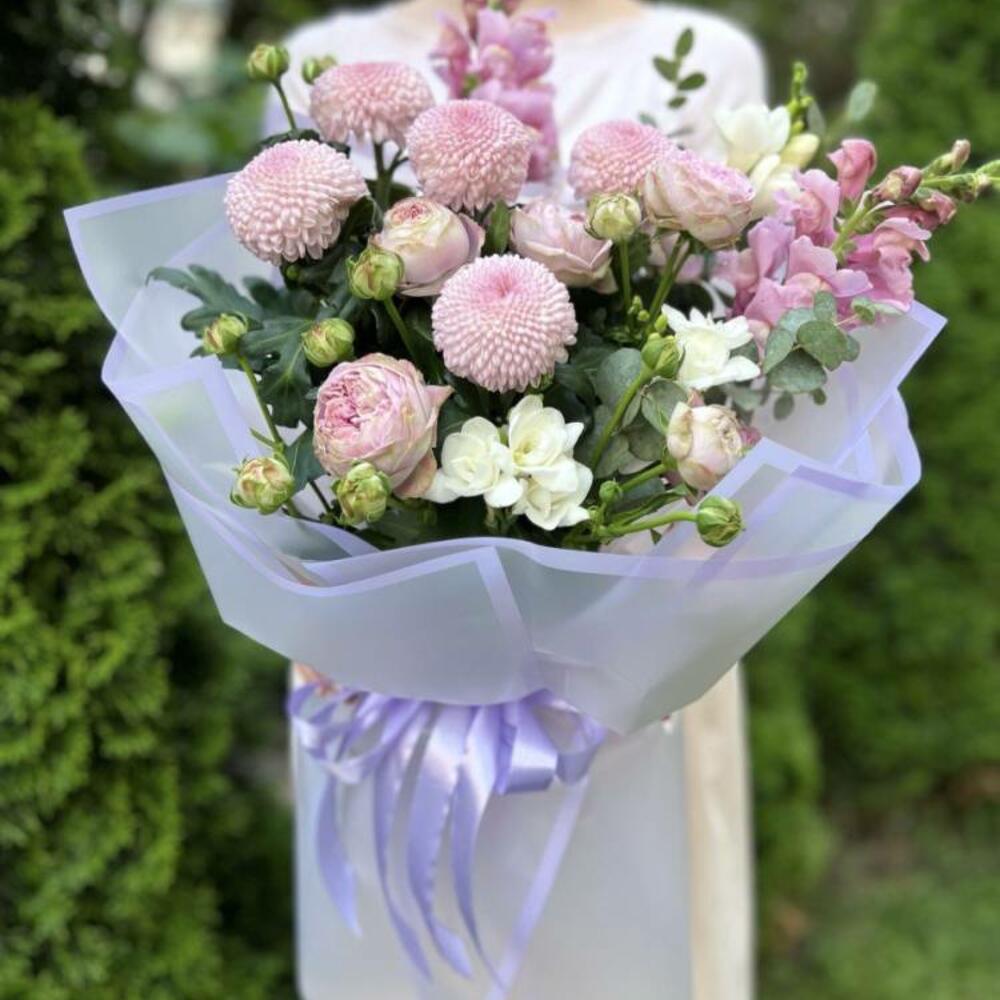 Composition: Chrysanthemum Momoko - 5, Antirrinum - 2, Freesia - 3, Rose spray Rich Babels - 3, Eucalyptus - 1, wrapping - 4, ribbon - 1 Sizes: WIDTH - 45CM; HEIGHT - 60CM; LENGTH - 60CM; (including packaging) Size: 45 x 60 x 60 cm