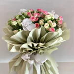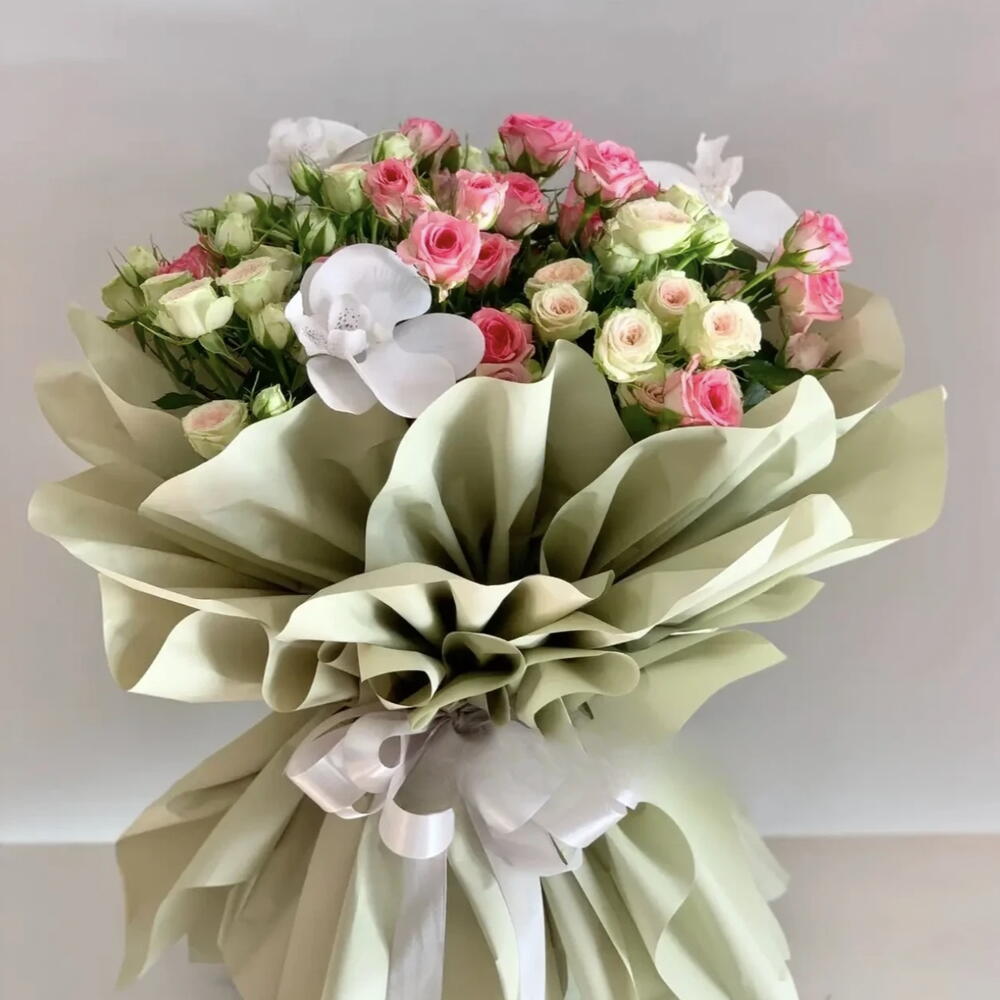 The bouquet features a mix of pink and white spray roses, along with white orchids. The flowers are arranged tightly together and wrapped in layers of light green paper, tied with a white ribbon at the base. The combination of pink and white roses often symbolizes admiration, happiness, and new beginnings, while white orchids can represent elegance and purity.