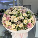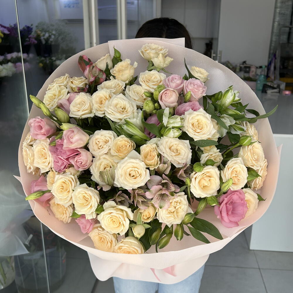 Experience the soft charm of our hand-tied arrangement, featuring a lush blend of creamy peach spray roses and delicate pink lisianthus. Accentuated by the graceful blooms of pink and white alstroemeria, this bouquet is wrapped in premium soft-toned paper for a truly luxurious finish. It’s the perfect sophisticated gift for birthdays, anniversaries, or just because.