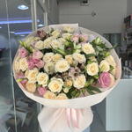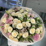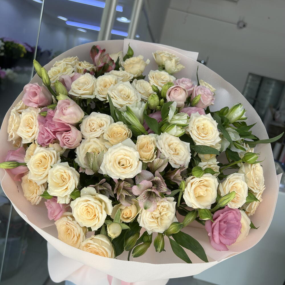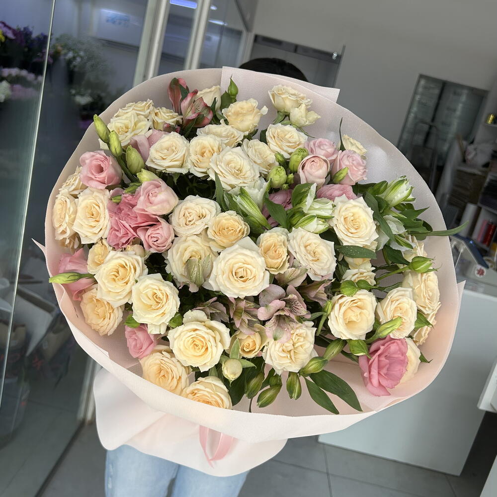alstroemerias - 4 pcs pink lisianthus - 4 pcs peach spray roses - 7 pcs