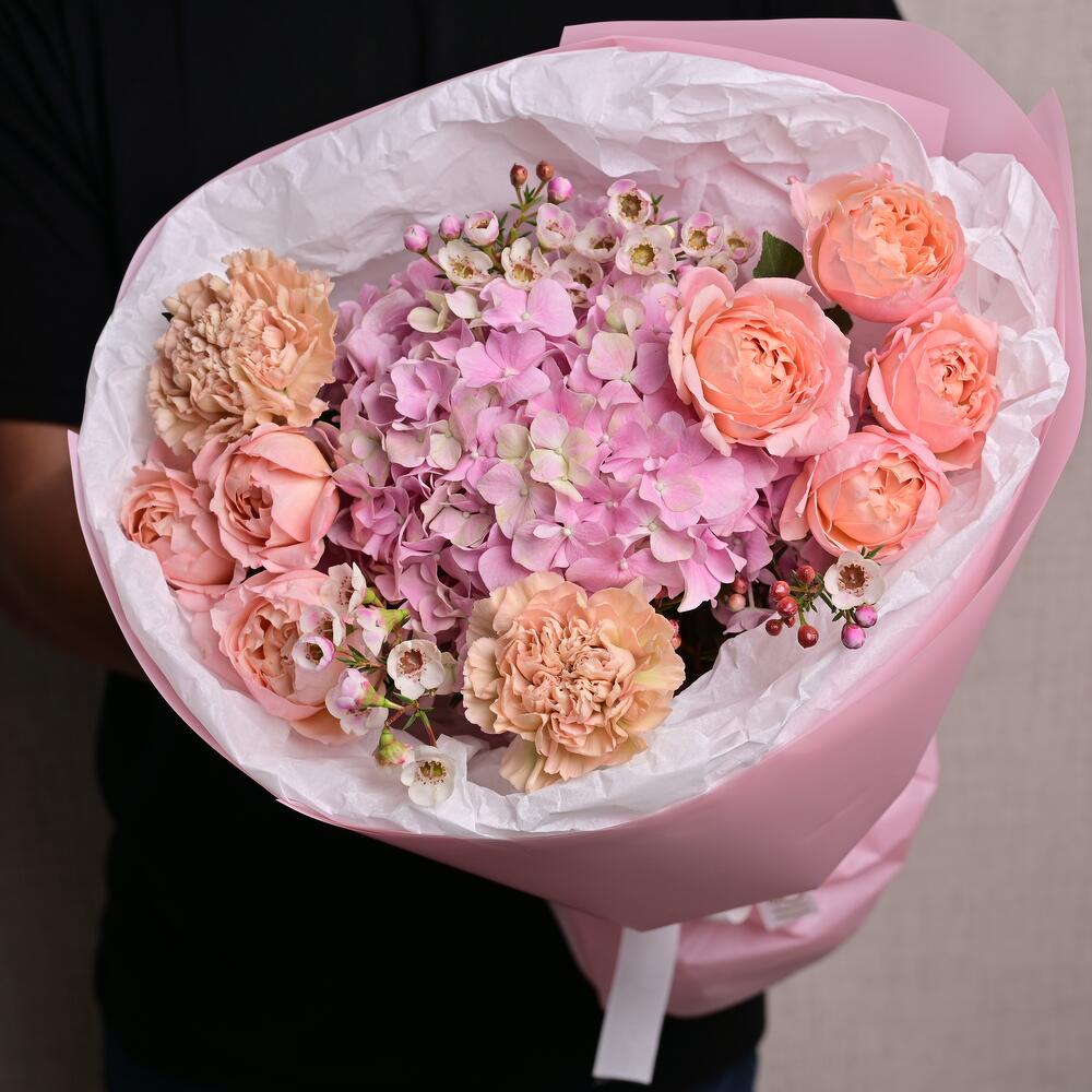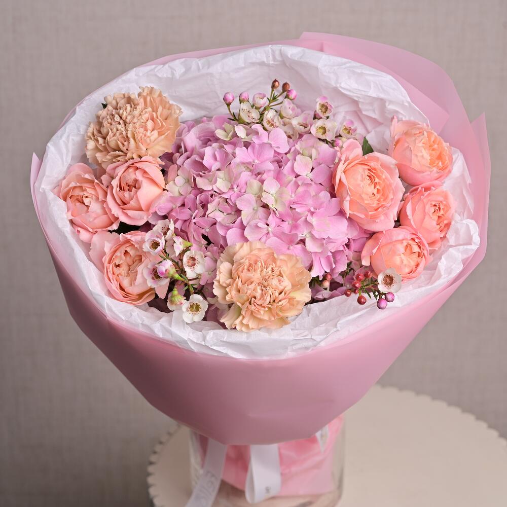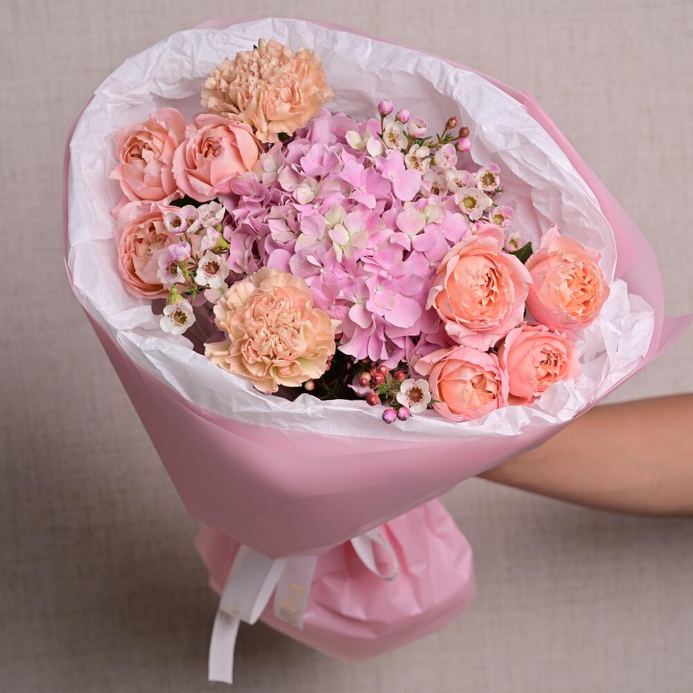 Pink hydrangea with Julieta roses, carnations, and wax flowers. Ideal for birthdays, thank-you gifts, or everyday occasions. Wrapped in premium packaging.
