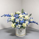 Modern and striking, this exquisite hatbox arrangement of elegant white roses paired with bold blue-tinted roses and eucalyptus branches creates a unique and sophisticated look. The cool, fresh color palette is perfect for making a statement — ideal for corporate gifts, anniversaries, or stylish home decor. Presented in a sleek white hatbox with gold detailing, this bouquet is a contemporary and memorable expression of beauty. To maintain the bouquet’s freshness, add clean, cool water to the floral foam inside the box every 1–2 days. Keep the arrangement away from direct sunlight, heat sources, and cold drafts. Remove any fading blooms to ensure it stays vibrant and eye-catching.