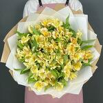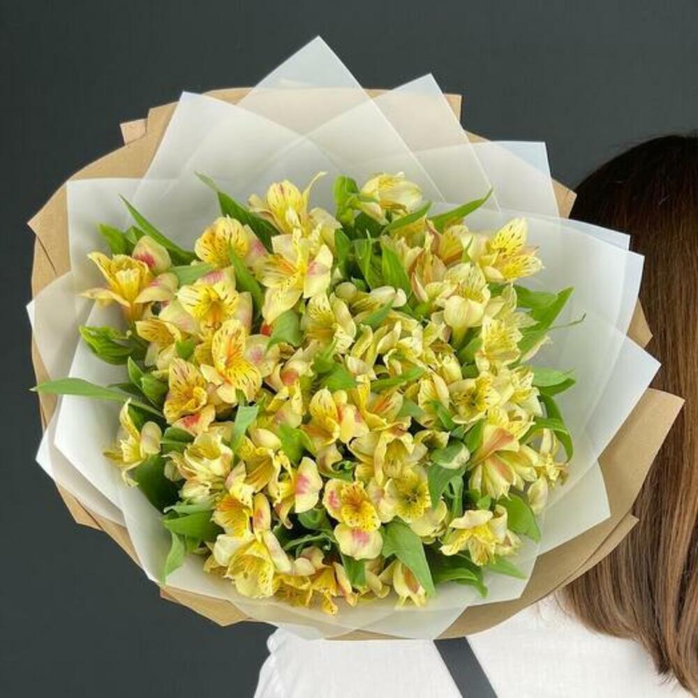 Brighten someones day with our bouquet, featuring radiant yellow alstroemerias. Each blossom bursts with vibrant color, symbolizing joy and friendship. These cheerful flowers are meticulously arranged and wrapped in kraft paper, adding a touch of natural elegance to the bouquet. Perfect for any occasion, this bouquet brings warmth and happiness to its recipient.