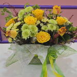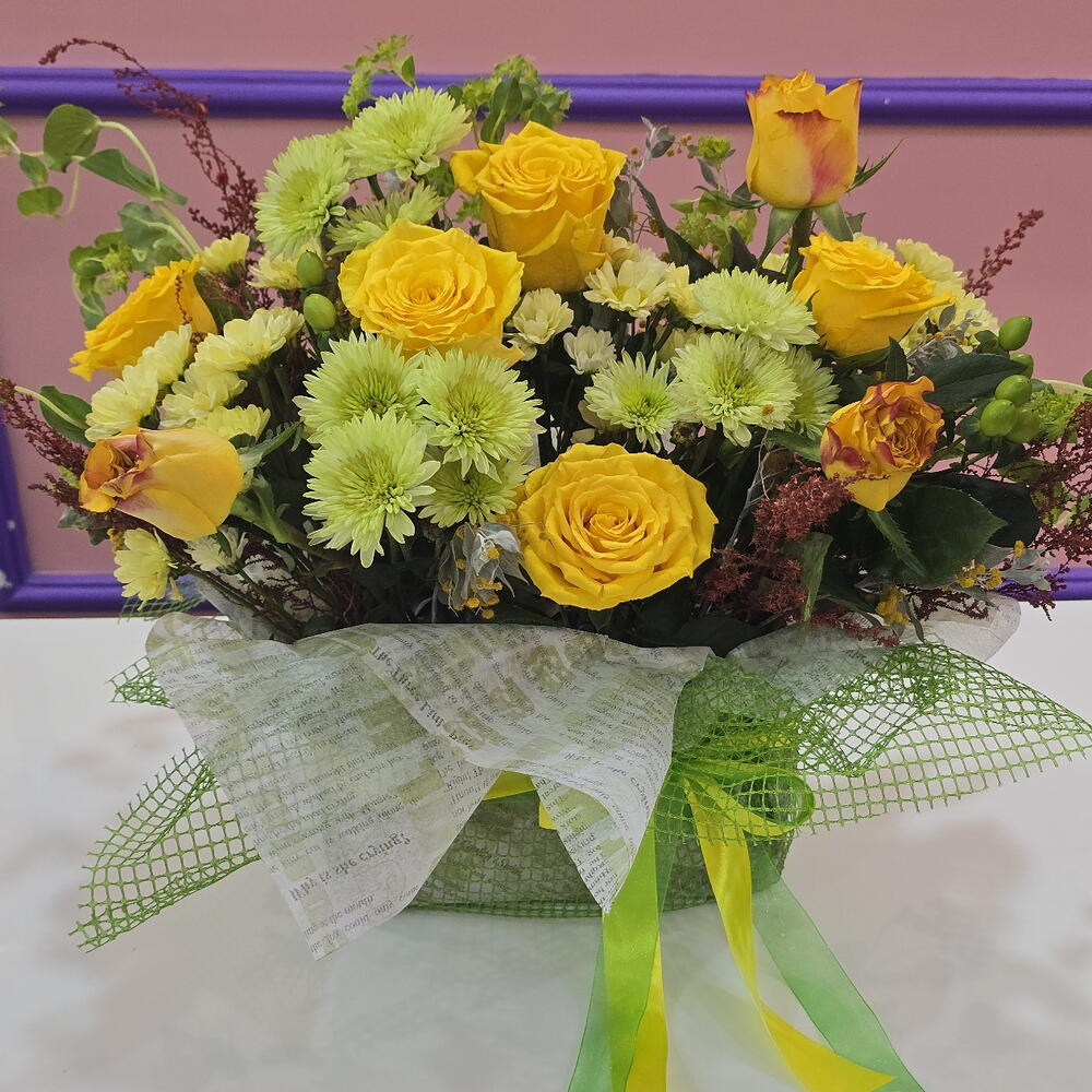 This vibrant floral arrangement, featuring bright yellow roses and cheerful green chrysanthemums, is a beautiful way to express your appreciation. The combination of yellow and green symbolizes joy, happiness, renewal, and balance, making it a perfect gift to convey positive sentiments and gratitude. Presented in an elegant container with a charming ribbon accent, this thoughtful gesture is sure to brighten their day and create a lasting impression.