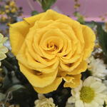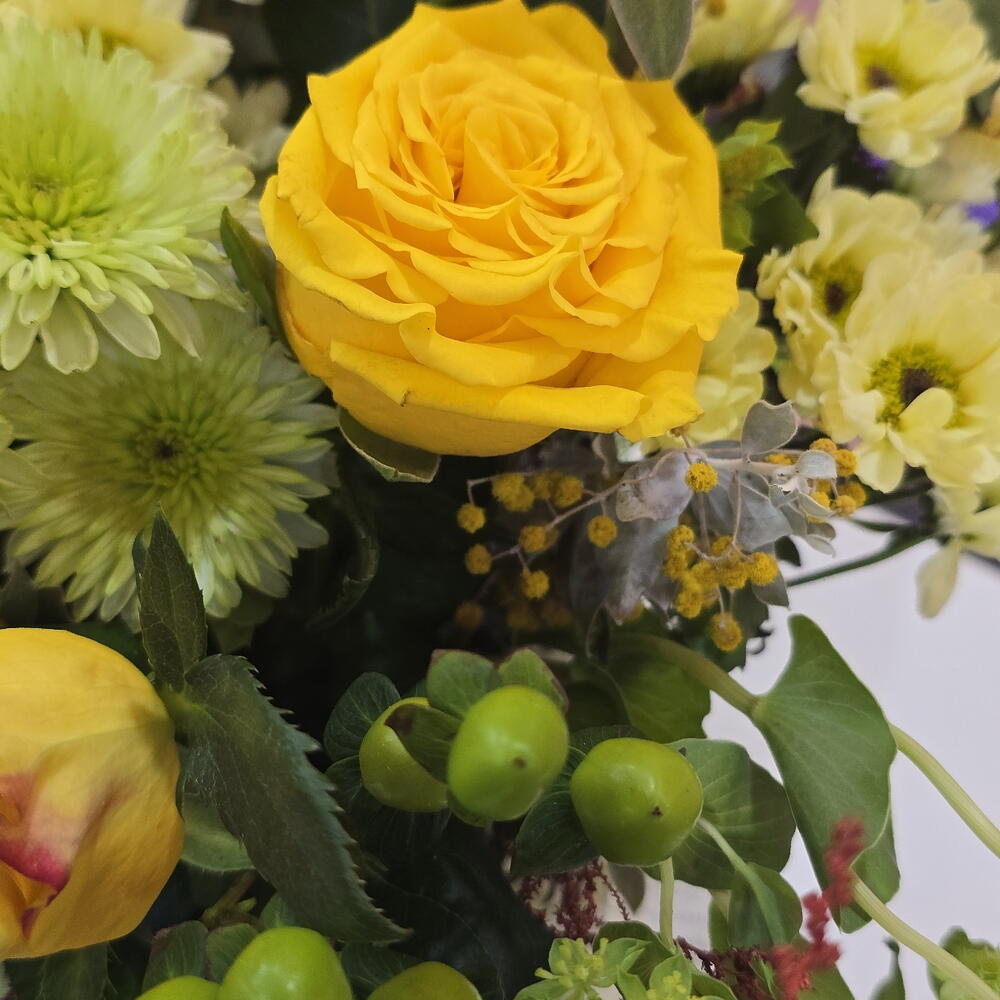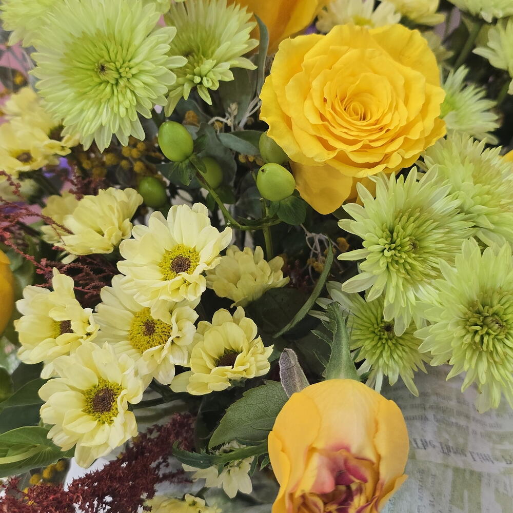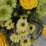 Greens - 6 pcs rose yellow - 8 pcs chrysanthemum green - 3 pcs bupleurum - 3 pcs hypericum green - 2 pcs chysanthemums yellow - 5 pcs