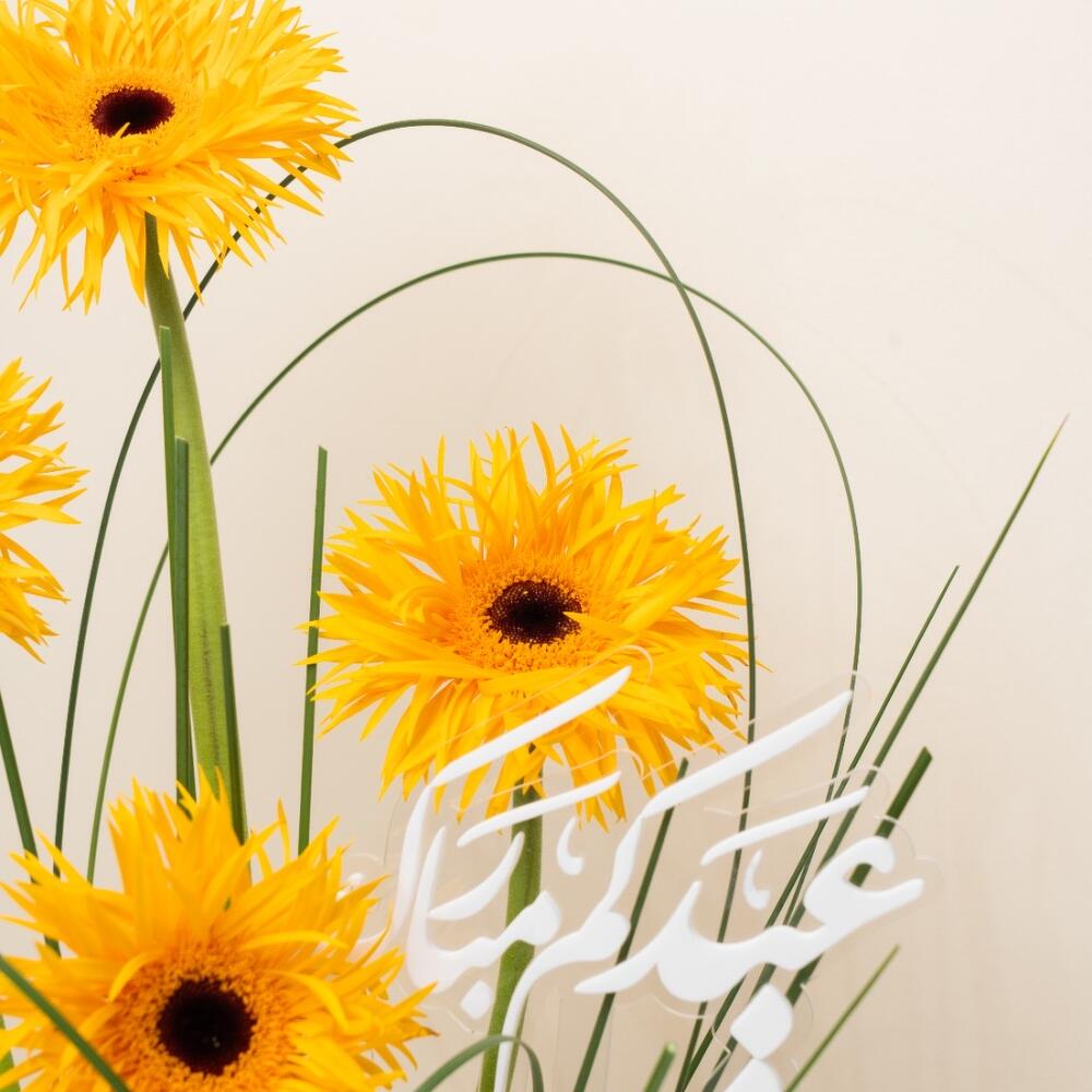Gerbera - 3 pcs Leaves - 3 pcs eid mubarak topper - 1 pcs